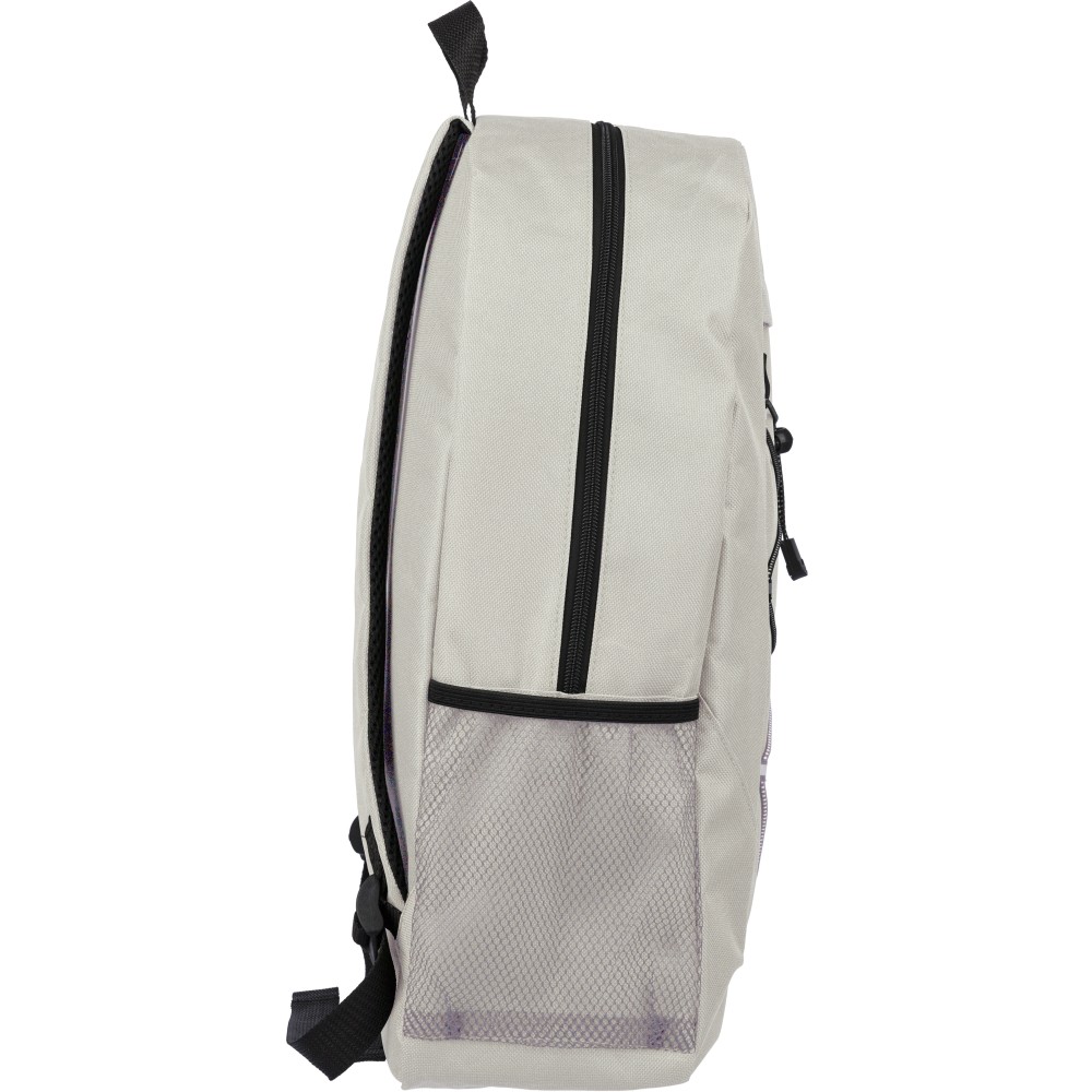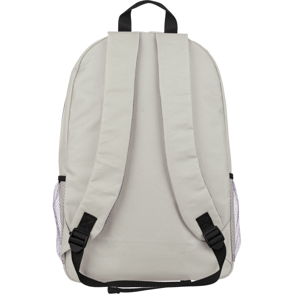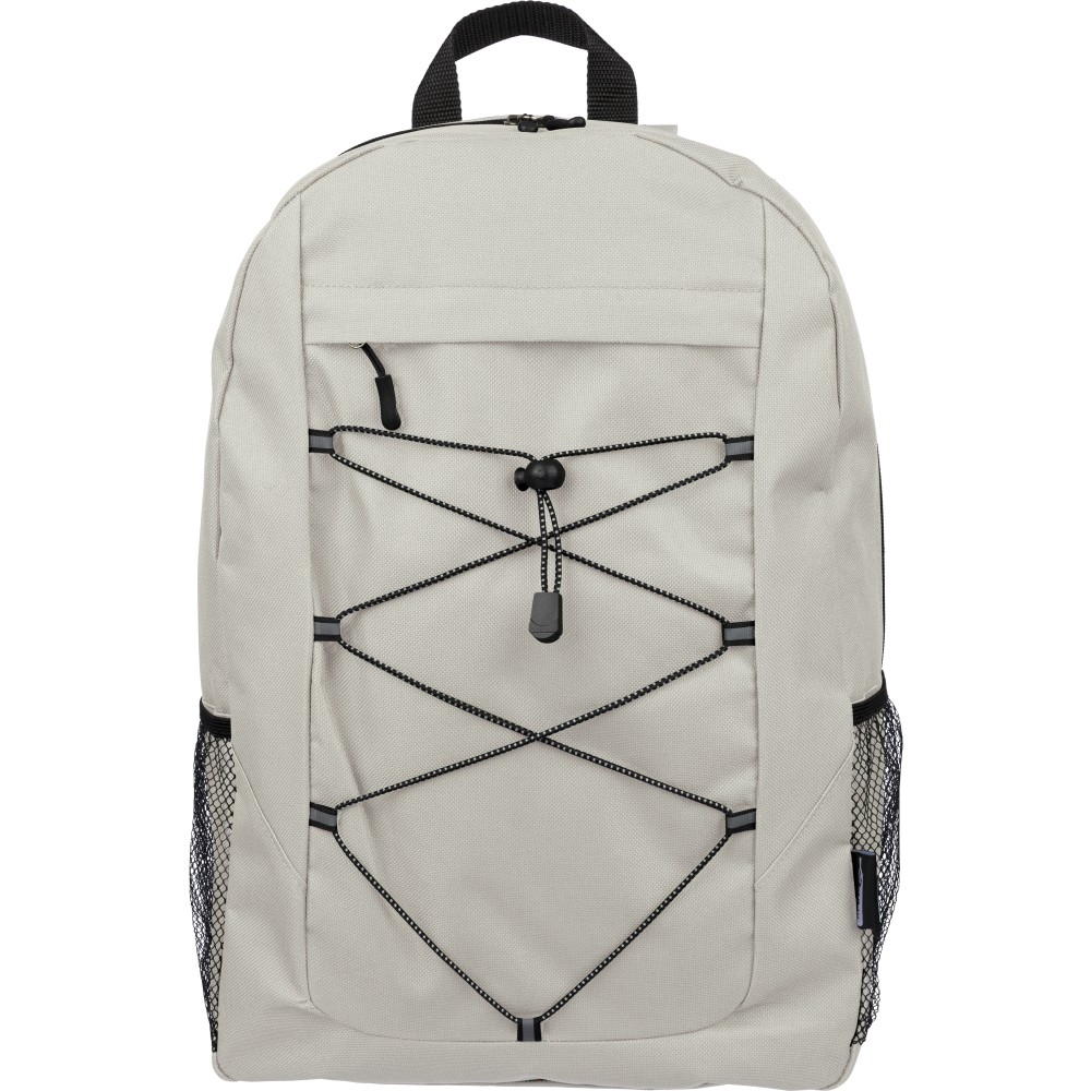 rPET polyester 600D adventure backpack with drawstring closure and large zippered main compartment. Features mesh side pockets, elastic front bands, small front zip pocket for decoration, adjustable straps, and rPET label.