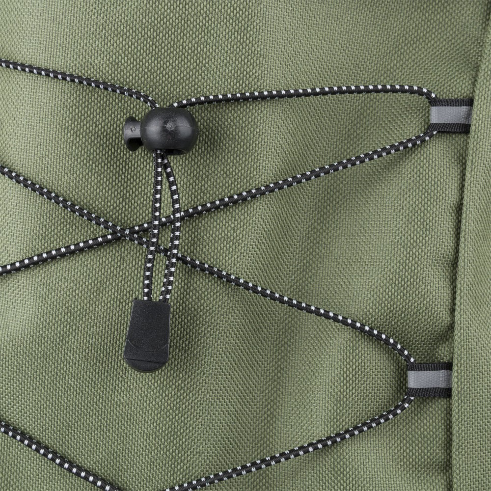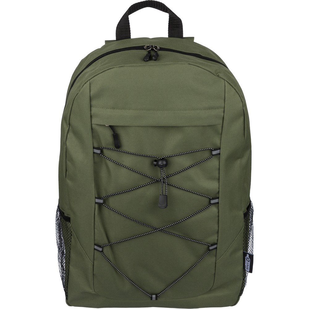 rPET polyester 600D adventure backpack with drawstring closure and large zippered main compartment. Features mesh side pockets, elastic front bands, small front zip pocket for decoration, adjustable straps, and rPET label.