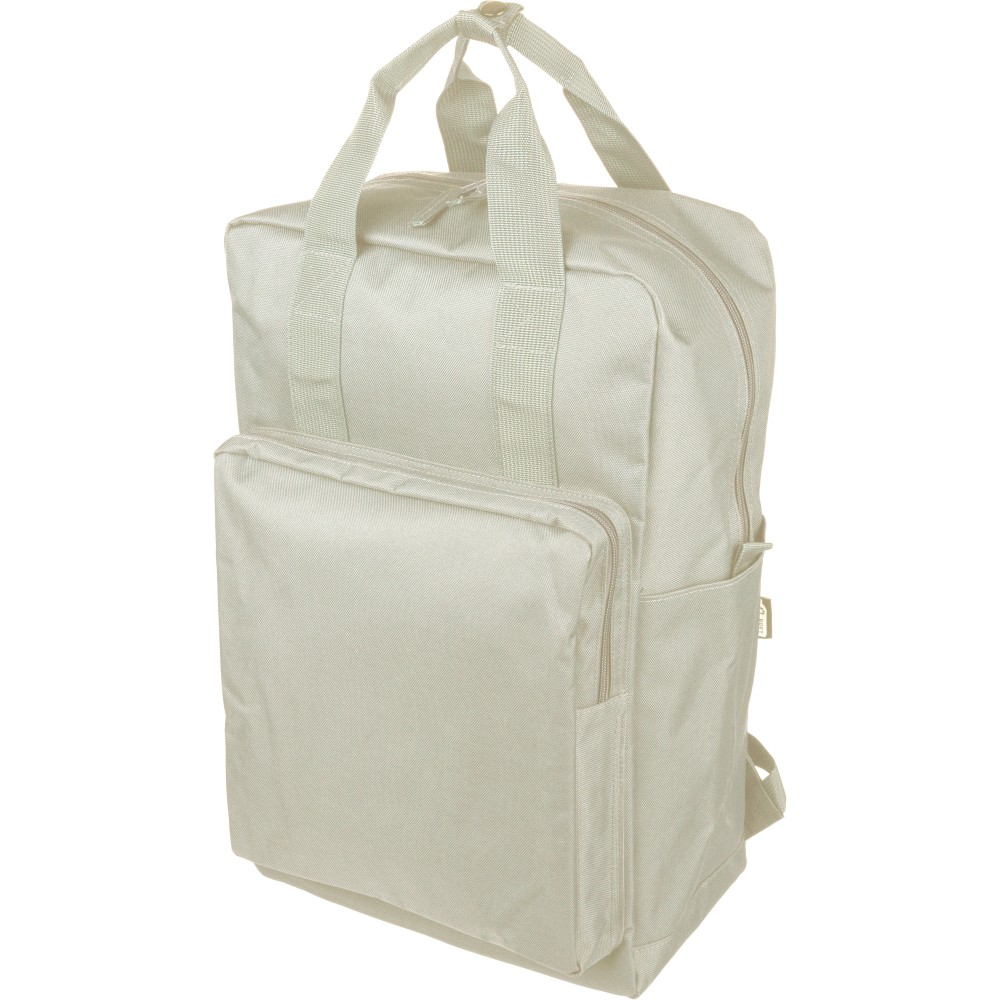Recycled 900D polyester backpack with 210D lining and rPET label. Includes large main compartment with 16? laptop pocket, front compartment, two side pockets, trolley strap, top handles with button, and ventilated shoulder straps.