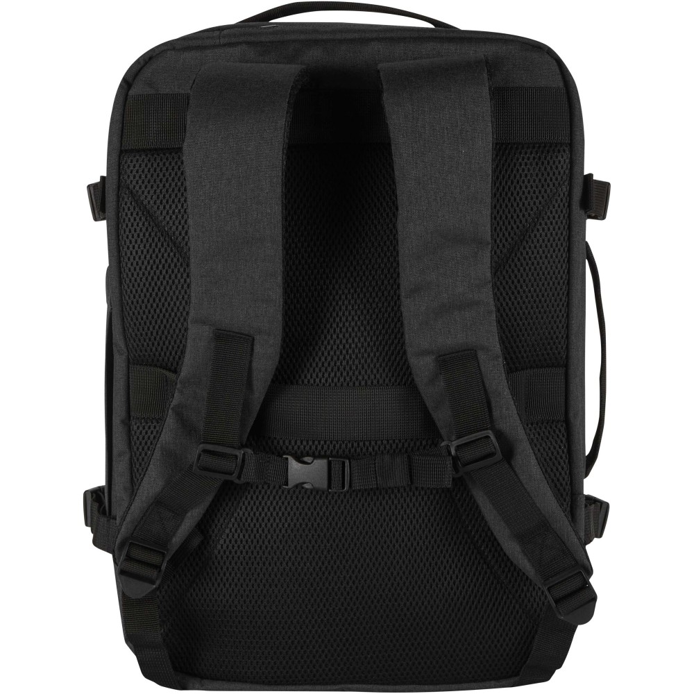 Made from GRS certified recycled polyester with an RPET lining, the Libra 17" carry-on backpack is designed to comply with airline cabin luggage requirements, making it an ideal travel companion. It includes a dedicated laptop compartment for devices up to 17", a spacious main section with elastic straps and mesh dividers to keep belongings secure and organised, and two large front zippered pockets for easy access to essentials. For comfort and convenience, the backpack features a breathable back panel, a trolley strap, adjustable shoulder straps with a cross-chest strap, and both top and side handles for versatile carrying options. Suitable for business trips, remote work, or weekend travel, this backpack combines a sleek design with practical functionality for life on the move.