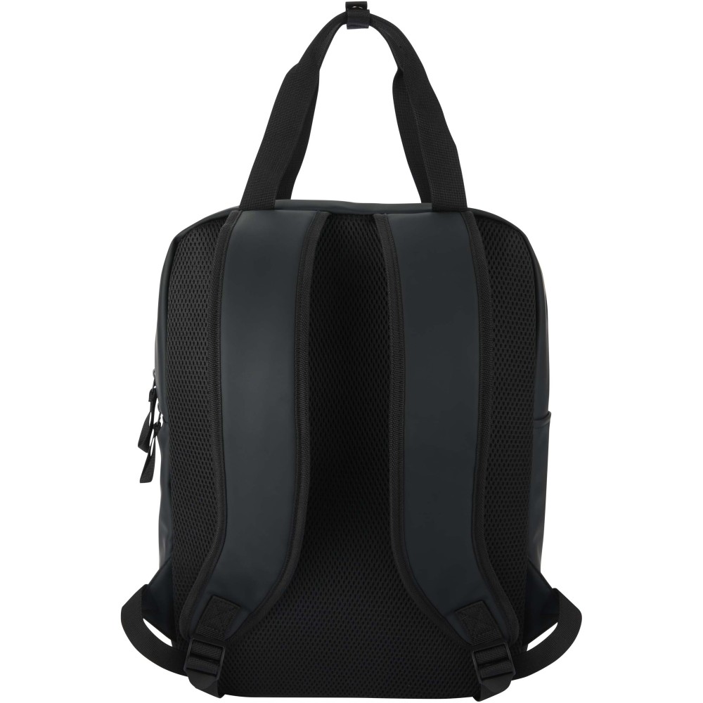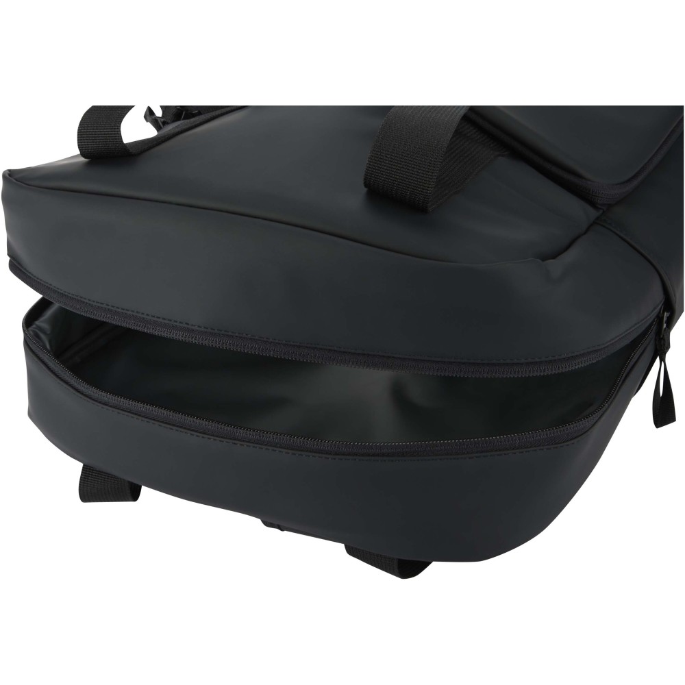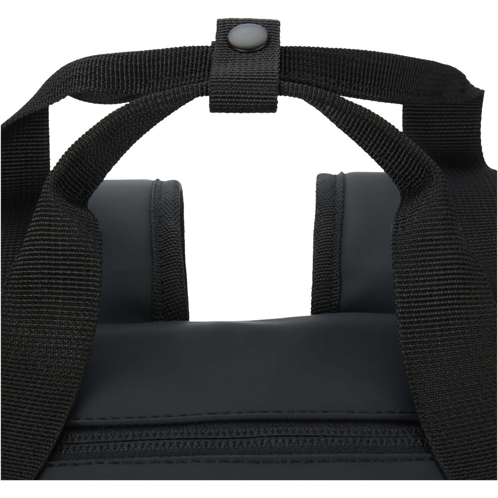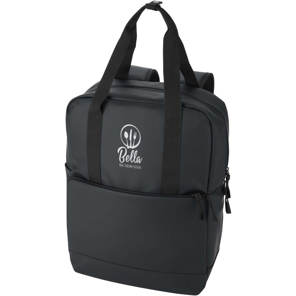 Made from GRS certified recycled PU leather with a matching RPET lining, this 18-litre backpack cooler backpack is designed for outdoor adventures. The spacious main compartment is insulated with high-quality PEVA lining and thick PE foam to keep food and drinks cool, while elastic webbing loops securely hold a bottle of wine. A large padded front zip pocket provides extra protection, and an open side pocket offers quick access to a drink bottle. For comfort, the bag includes breathable mesh on the back and adjustable and padded shoulder straps. Perfect for picnics, beach trips, and camping.