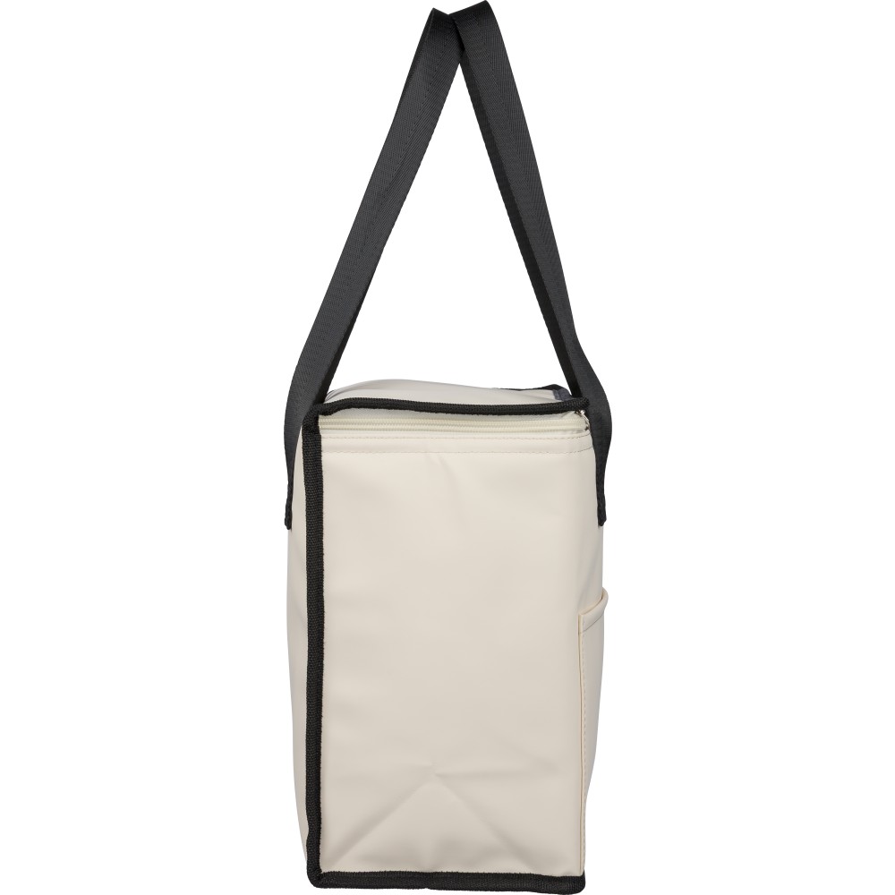 Recycled PU cooler bag (9 L capacity) with 210D recycled polyester lining. Features long carrying handles (2.5 × 66 cm) and a front pocket for additional storage. Includes a small recycled logo inside the label.