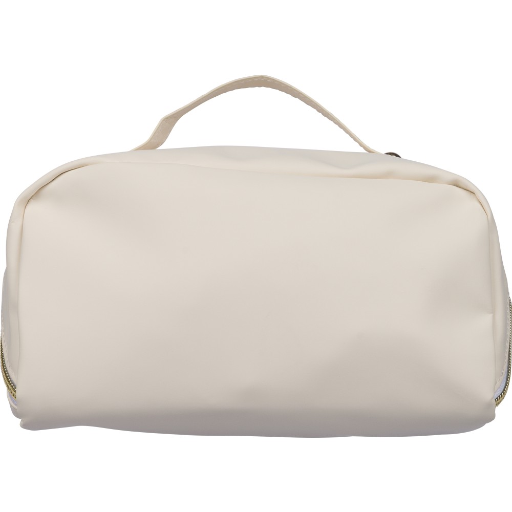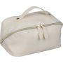 Recycled PU toilet bag with central zipper for wide opening. Features short handle, spacious interior with four compartments, including one inner zip pocket. Finished with 210D recycled lining and single recycled label inside.