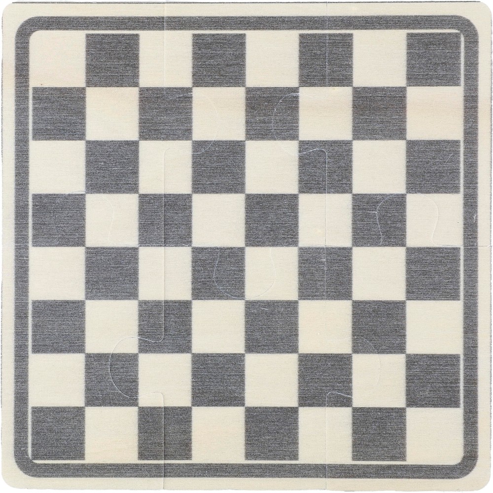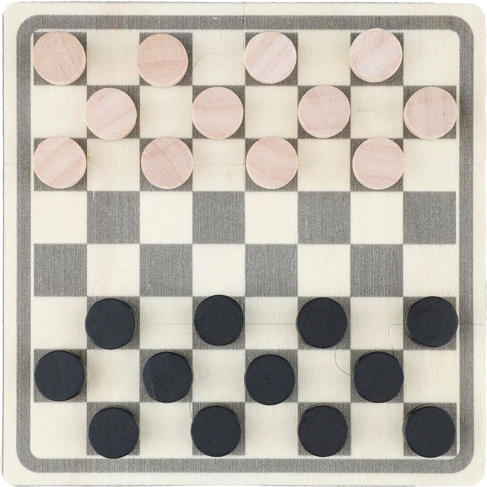 Wooden chess and checkers game in a cotton drawstring pouch. Includes a 6-piece printed puzzle (black/natural playing field) to assemble the playing boards, and 16 printed wooden chips featuring chess player designs. The wooden chips come in natural and black colors. Includes playing instructions. Label inside the pouch. The playing field is made of polywood, and the chips are made of pine wood.