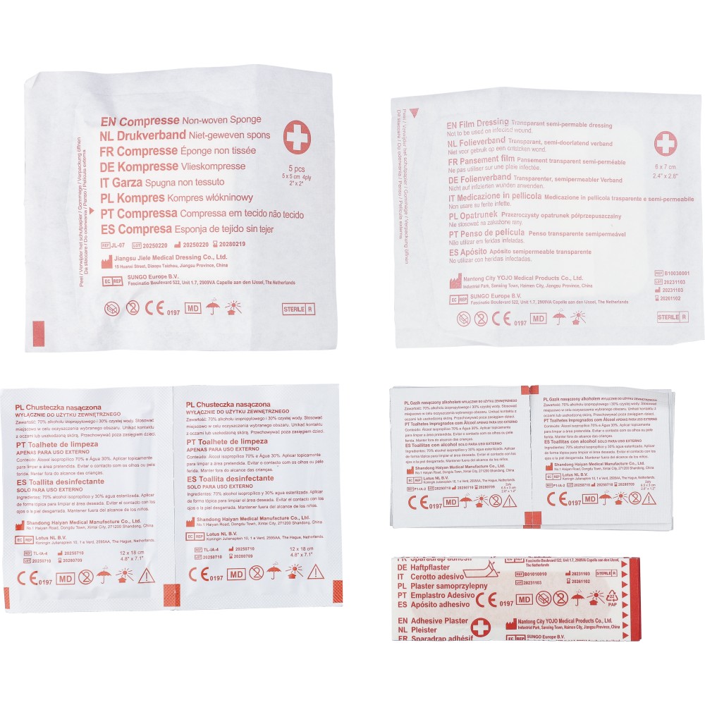 rPET 600D polyester first aid pouch with velcro closure and carrying loop. Includes PVC pockets and 17 parts: 5 plasters, 1 sterile film dressing, 1 non-woven sponge, 8 alcohol pads, 2 cleaning towelettes. Finished with rPET label outside.