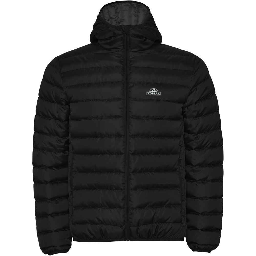 Men's feather touch quilted jacket with fitted hood. Inverted zips with matching chin protector. Two front pockets with zip. Matching elastic trim in cuffs, hem and hood. Contrasting inner lining. Stow carry bag included. Light and foldable garment. Water resistant. Wind-proof model. 100% Polyester, 290 g/m2, Lining, of 100% Polyester, Padding/filling, of 100% Polyester.