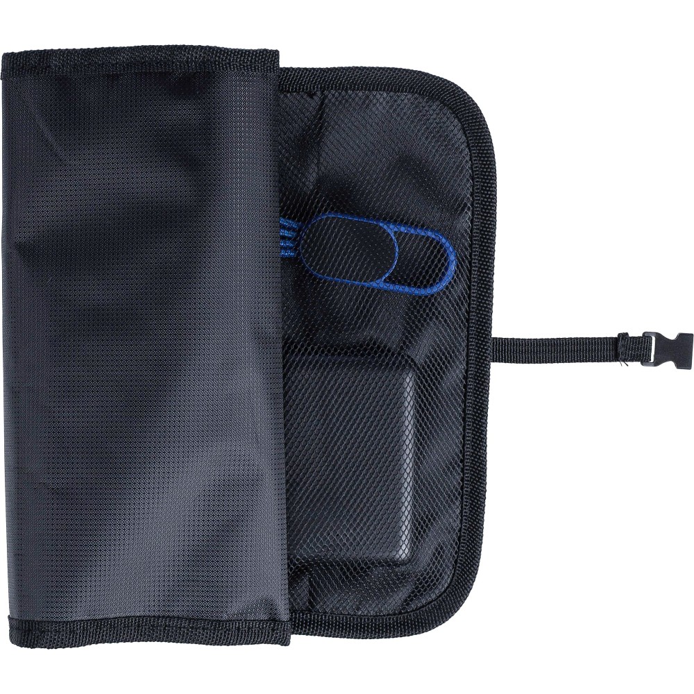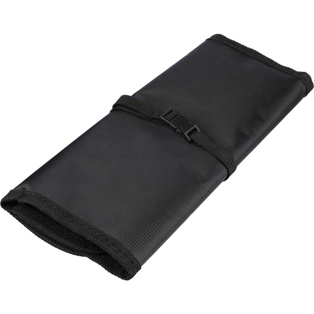 1680D polyester roll-up bag with a plastic buckle. With multiple pockets and zippered compartments inside for storing charging cables or devices.