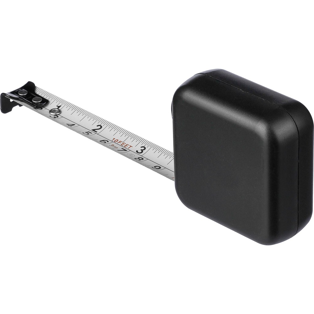ABS tape measure. 3 meters in length. Tape made from metal (16 mm) printed with both centimeters and inches. Ultrasonically assembled (screwless). Includes push button with lock. Individually packaged in a brown cardboard box.