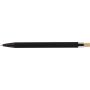 Recycled aluminium ballpen with bamboo push button featuring an AS plastic detail. Includes a metal clip and plastic tip, both in matching colors. Laser-engraved recycled logo on the barrel. Approximate writing length of 800 metres. Blue ink.