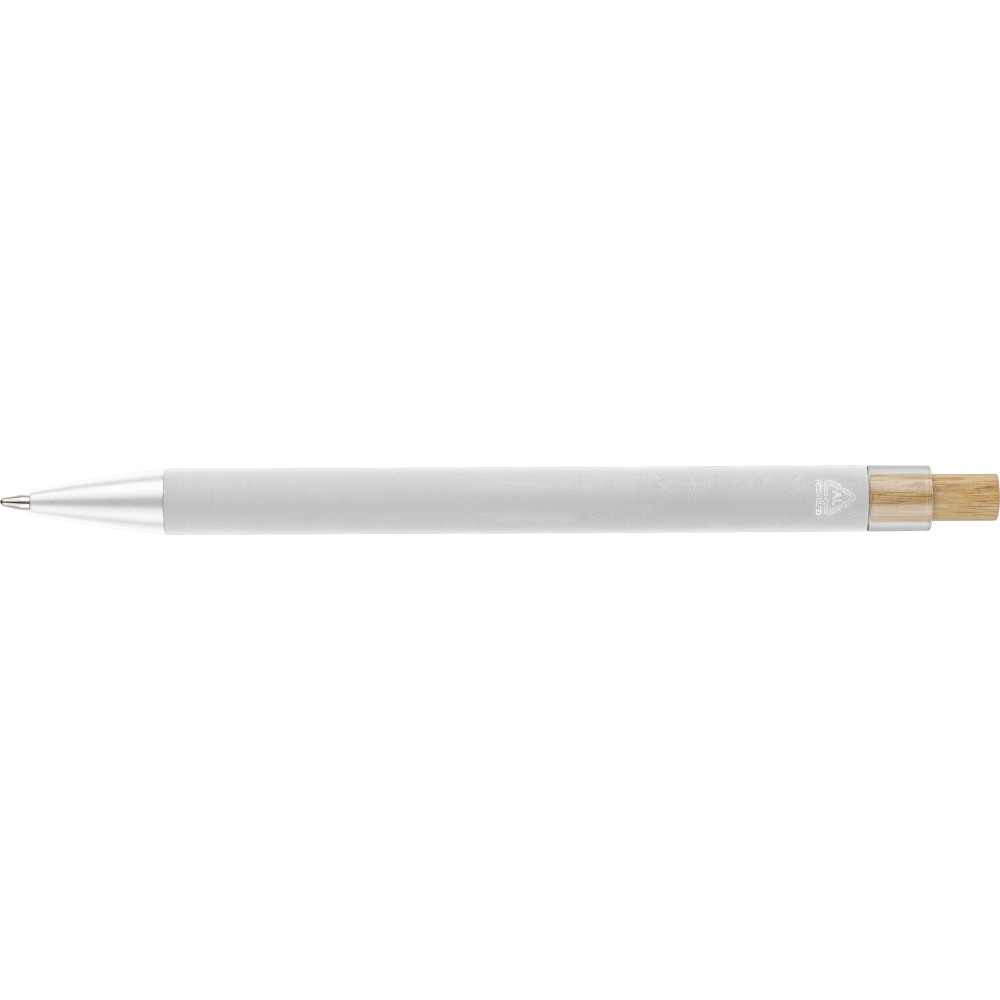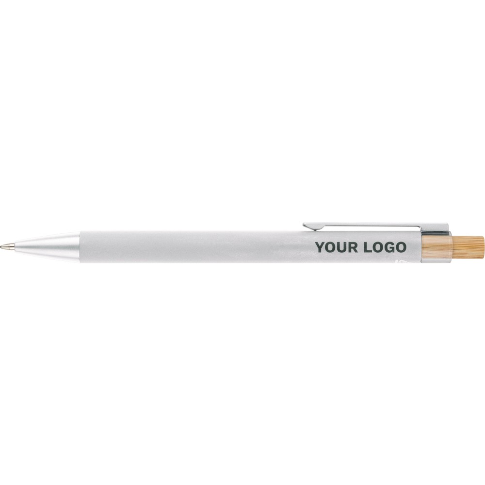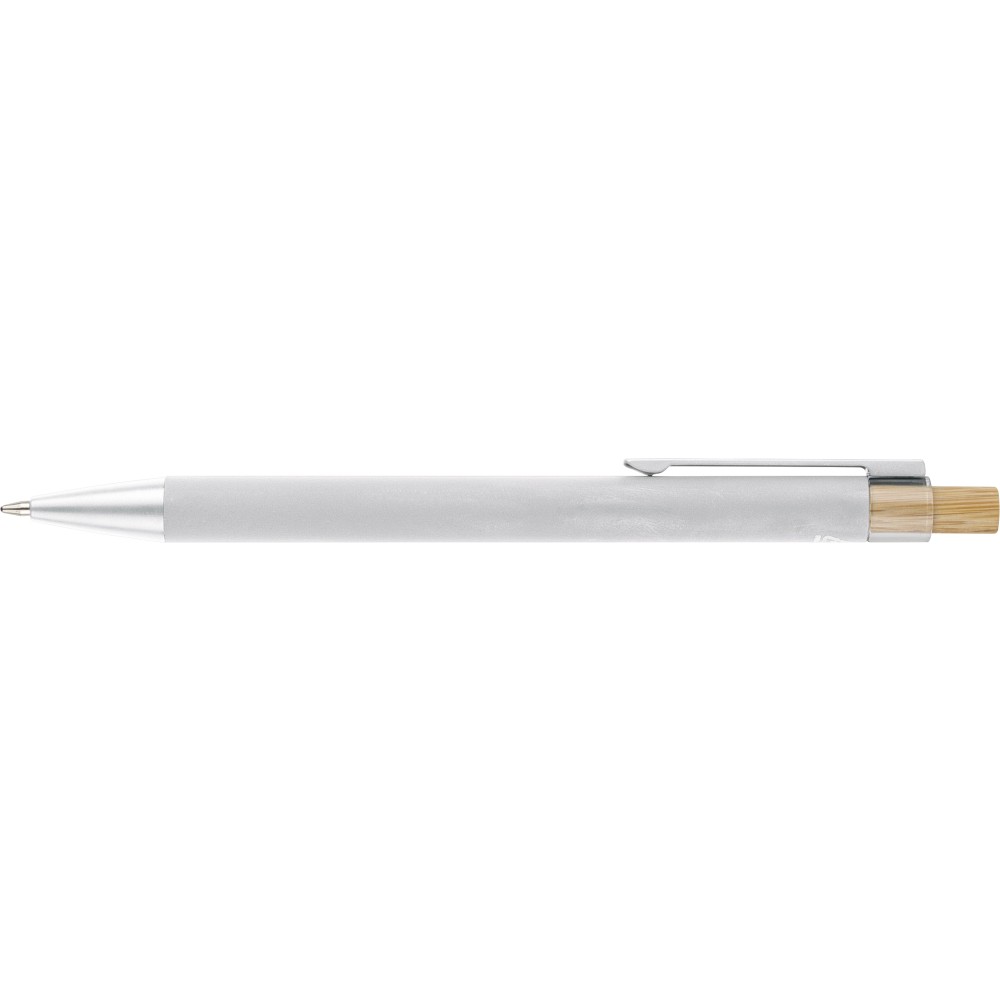Recycled aluminium ballpen with bamboo push button featuring an AS plastic detail. Includes a metal clip and plastic tip, both in matching colors. Laser-engraved recycled logo on the barrel. Approximate writing length of 800 metres. Blue ink.