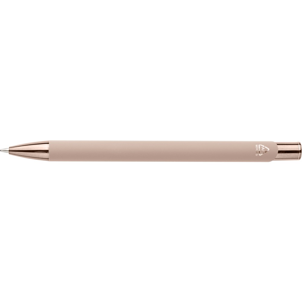 Recycled aluminium rubberized ballpen with matching UV-coated plastic and metal details. Shiny mirror effect appears after engraving. Features engraved recycled logo and writes approx. 800 metres. Blue ink.