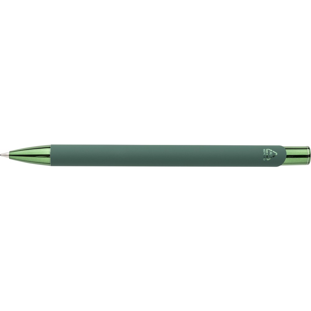 Recycled aluminium rubberized ballpen with matching UV-coated plastic and metal details. Shiny mirror effect appears after engraving. Features engraved recycled logo and writes approx. 800 metres. Blue ink.