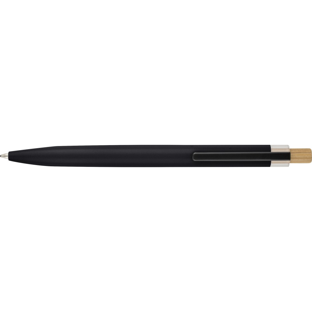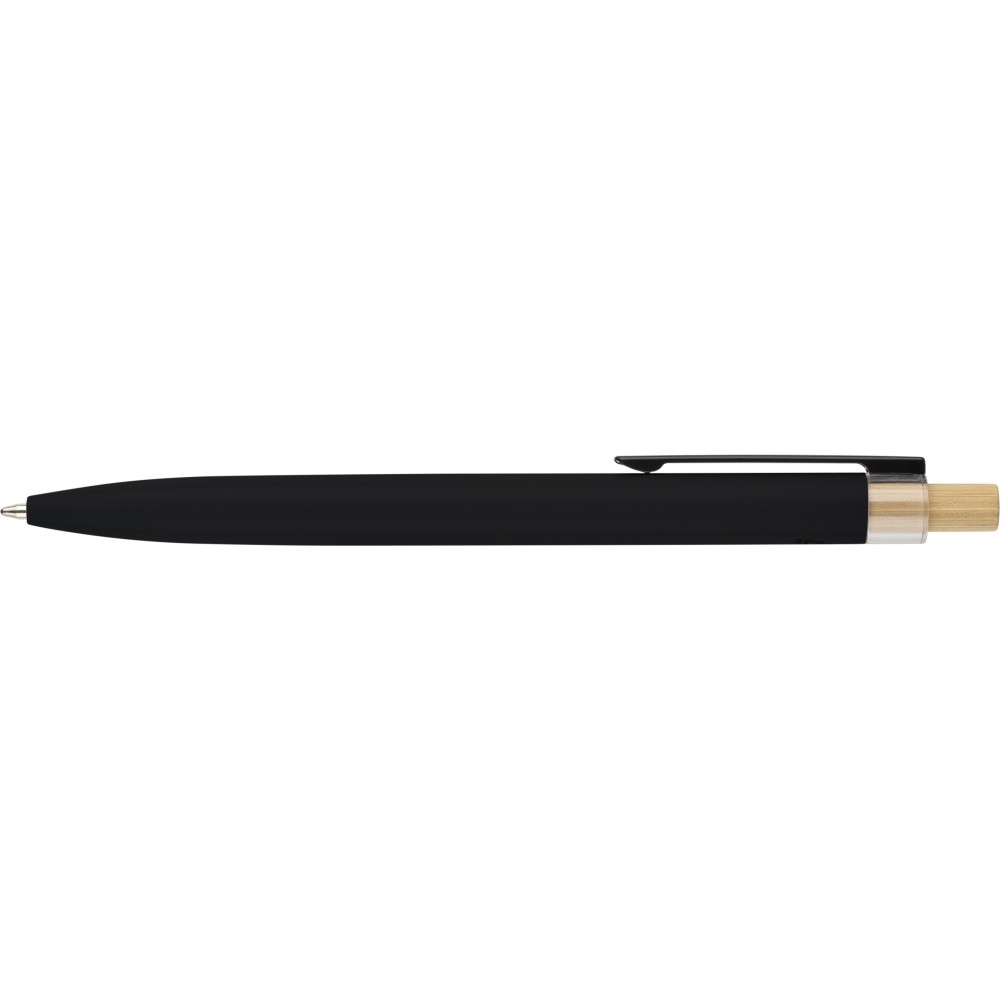 Recycled aluminium lacquered push ballpen with bamboo pusher, rPET trim, and metal clip. Features an engraved recycled logo. Approximate writing length of 700 metres. Blue ink.