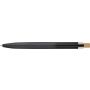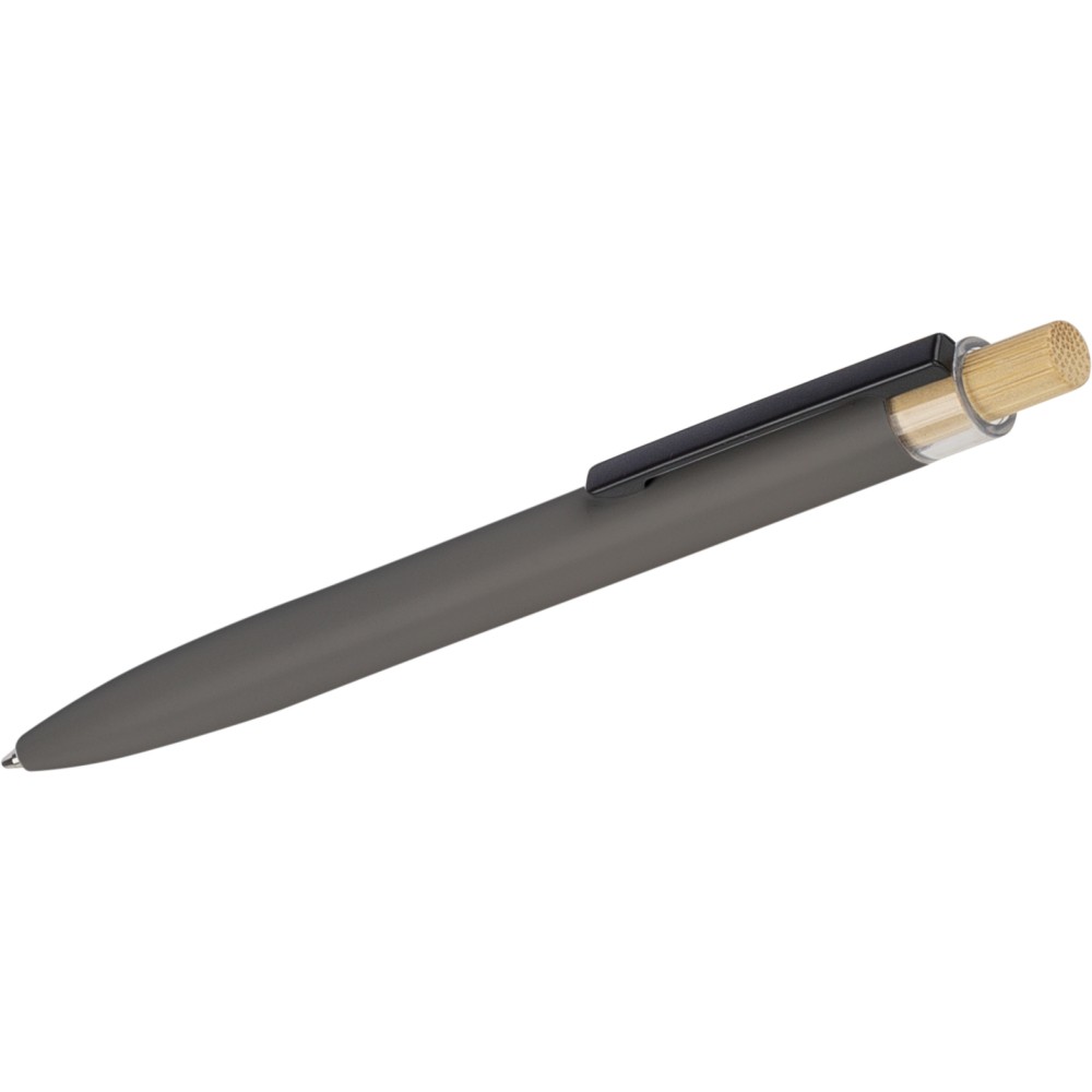 Recycled aluminium lacquered push ballpen with bamboo pusher, rPET trim, and metal clip. Features an engraved recycled logo. Approximate writing length of 700 metres. Blue ink.