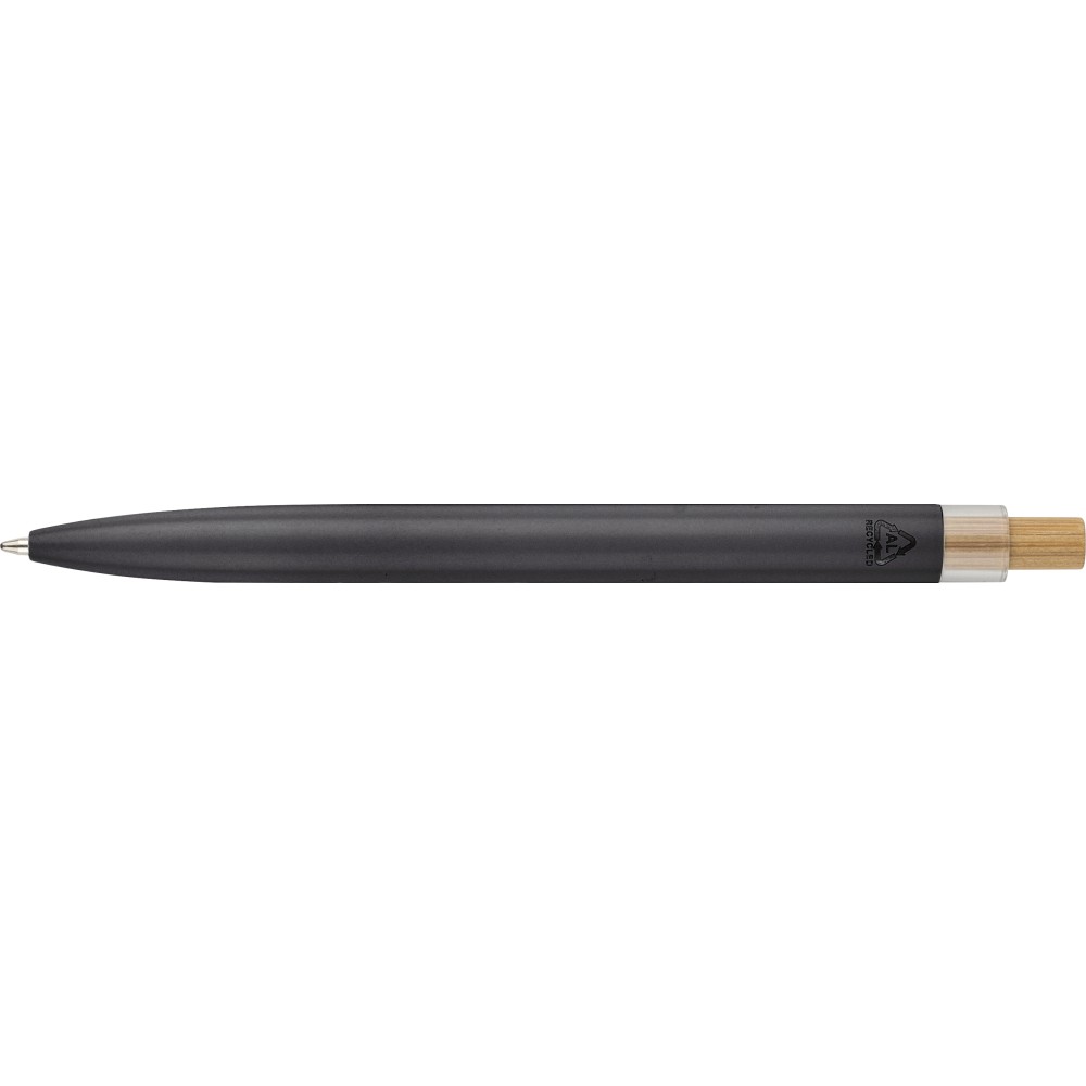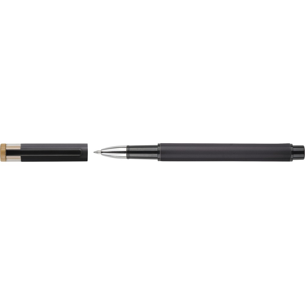 Recycled aluminium lacquered pen set with ballpen and roller pen. Features bamboo pusher, rPET trim, and metal clip; roller pen includes bamboo/rPET cap detail and matching clip. Both with engraved recycled logo. Writes approx. 700 m (ballpen) and 500 m (roller pen). Blue ink. Packed in colored recycled cardboard gift box.
