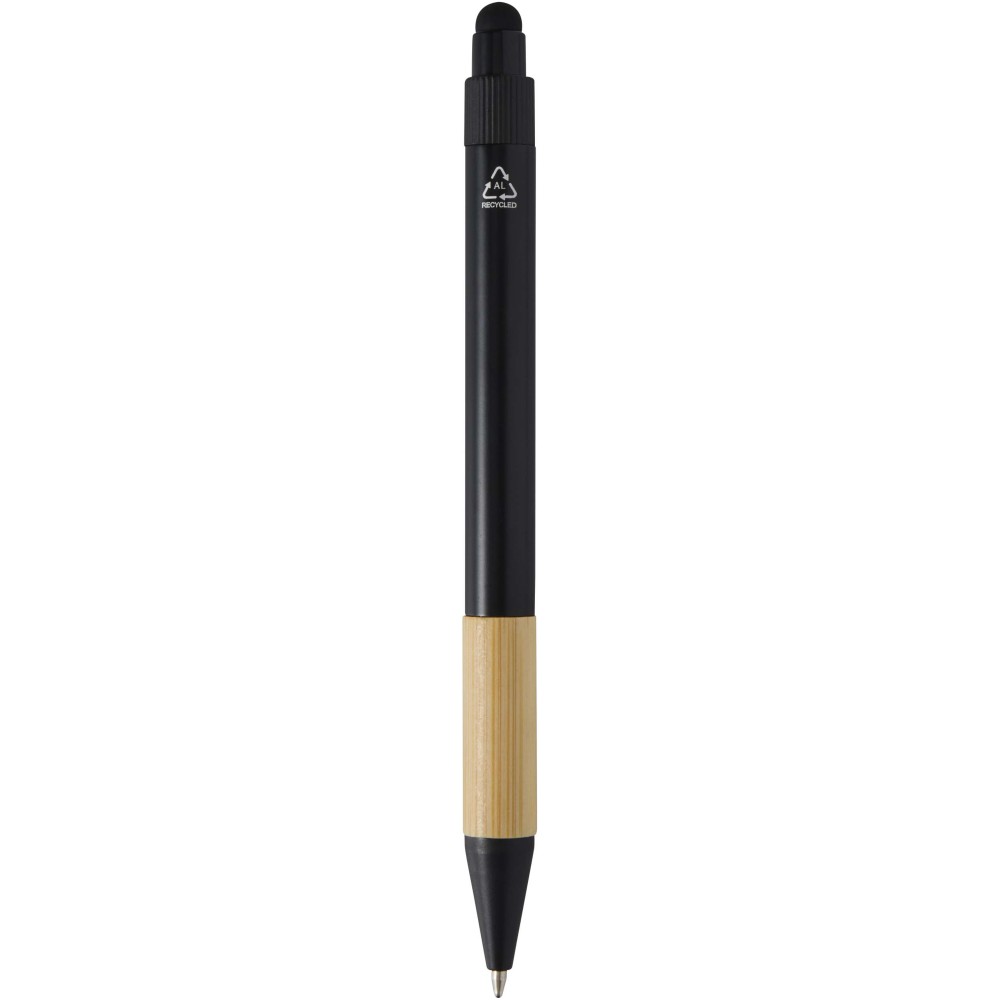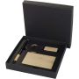 The Minka gift set includes a ballpoint pen made from RCS certified recycled aluminium with a stylish bamboo grip and stylus tip, an aluminium keychain (5.5 × 1.8 × 1 cm) with bamboo details and an integrated phone holder, and an RFID card holder (9.7 × 6.2 × 1 cm) with an aluminium alloy body and bamboo details, providing protection for up to 10 cards. The pen contains black ink with a writing length of 1000 metres. A thoughtful and practical gift that combines functionality with modern design. Supplied in a premium black gift box (16 × 16 × 2.7 cm) with a plain front, ideal for adding a logo.