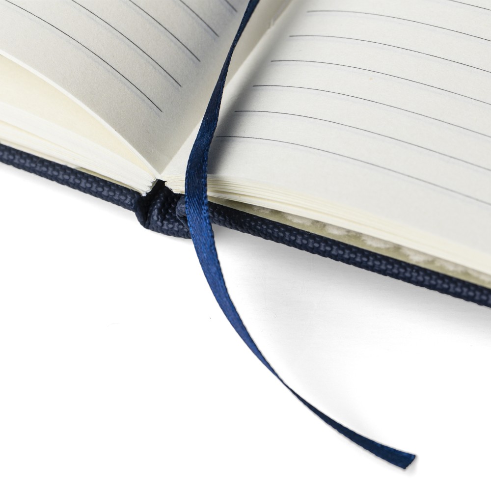 rPET 600D polyester notebook with PU coating, paper size A5. Contains 80 sheets of 70 gsm lined paper and features a ribbon bookmark, elastic band, and pen loop. Semi-hard cover design. Includes an embossed recycled logo on the backside.