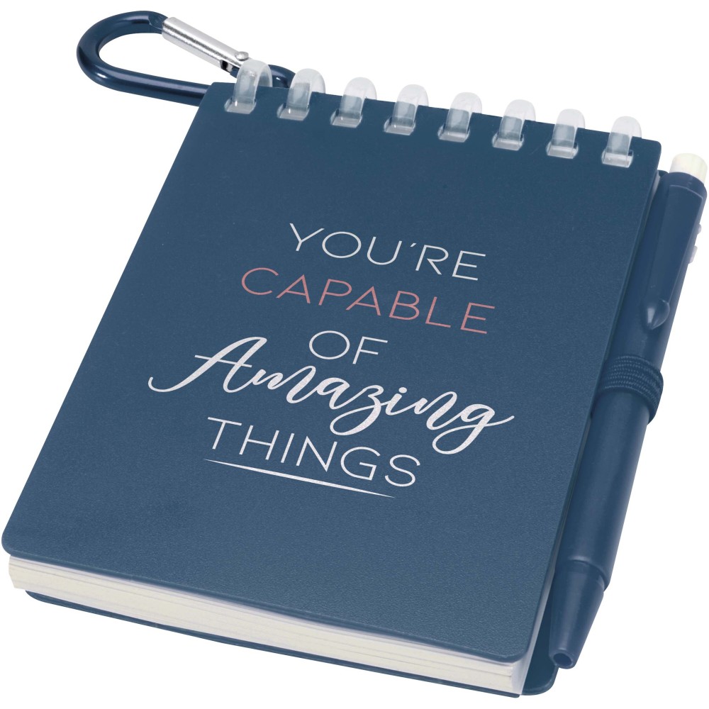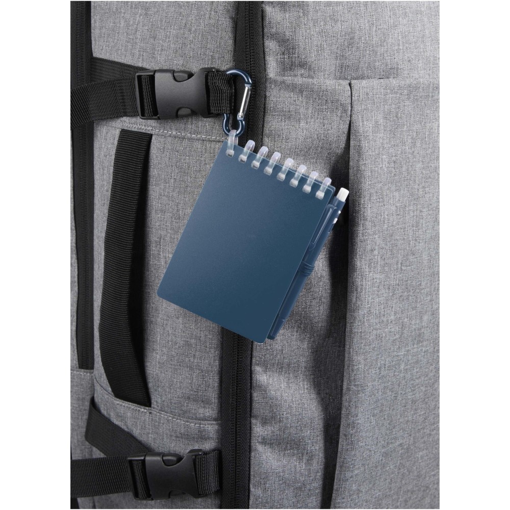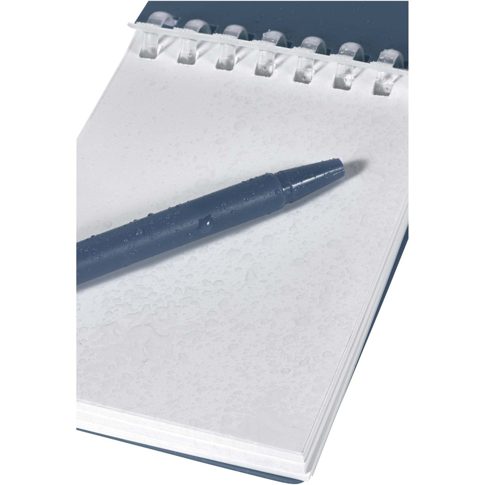 The Lig Mini notebook and pen set is a compact and practical companion for on-the-go note-taking. The spiral-bound notebook has a soft recycled plastic cover and 70 blank sheets of 120 g/m2 water-resistant stone paper, making it ideal for outdoor use. With rounded corners and a built-in pen loop, it embraces the mini-size trend while remaining functional. The matching ballpoint pen is made from recycled ABS plastic, writes in black ink, and offers a writing length of 250 metres. A colour-coordinated metal ring allows the set to be easily attached to a backpack, purse, or keychain, making it perfect for durable and portable note-taking. Notebook size: 11 × 7.5 cm.