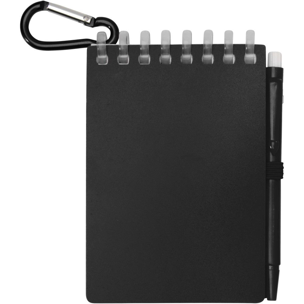 The Lig Mini notebook and pen set is a compact and practical companion for on-the-go note-taking. The spiral-bound notebook has a soft recycled plastic cover and 70 blank sheets of 120 g/m2 water-resistant stone paper, making it ideal for outdoor use. With rounded corners and a built-in pen loop, it embraces the mini-size trend while remaining functional. The matching ballpoint pen is made from recycled ABS plastic, writes in black ink, and offers a writing length of 250 metres. A colour-coordinated metal ring allows the set to be easily attached to a backpack, purse, or keychain, making it perfect for durable and portable note-taking. Notebook size: 11 × 7.5 cm.