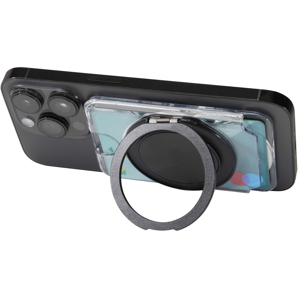 A practical gift set featuring an A6 notebook and MagSafe wallet. The notebook has a dark grey recycled plastic cover, 80 lined cream-coloured sheets of 70 g/m2 paper, and a black elastic closure. The transparent MagSafe wallet holds one card and attaches magnetically to iPhone 12 or newer models, and also comes with an extra metal ring for use with other phones. Both items are presented in a sleek black cardboard gift box.