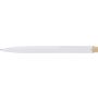 Recycled ABS ballpen with bamboo push button and white clip, suitable for digital printing. Features a recycled logo in the in-mould. Approximate writing length of 600 metres. Blue ink.