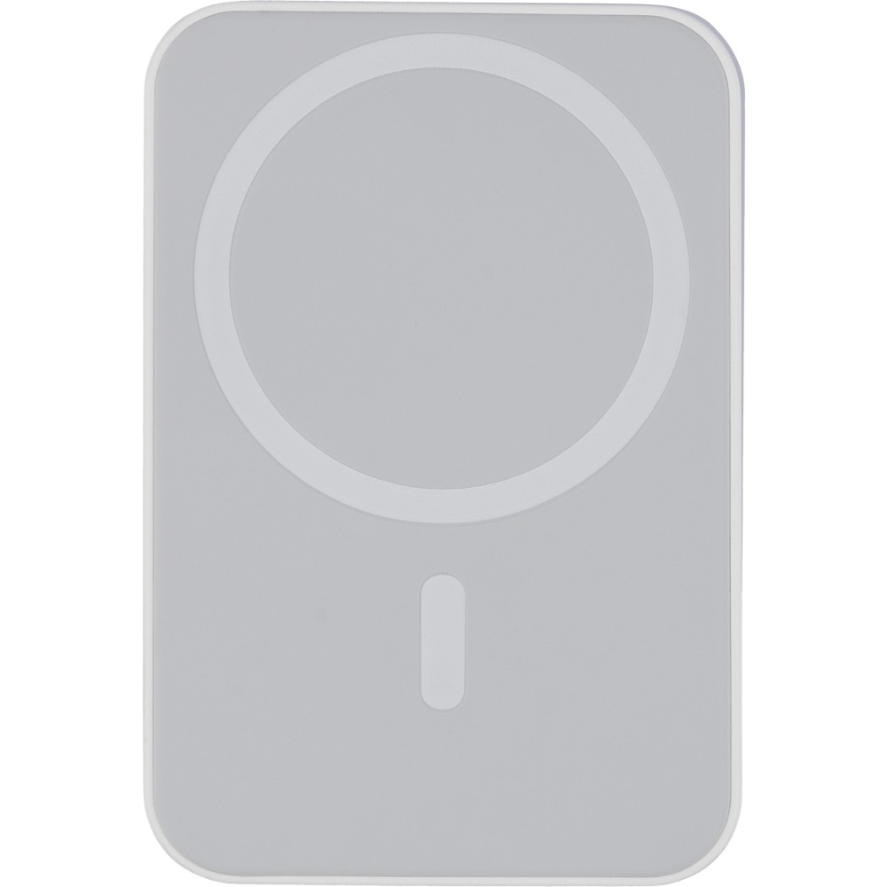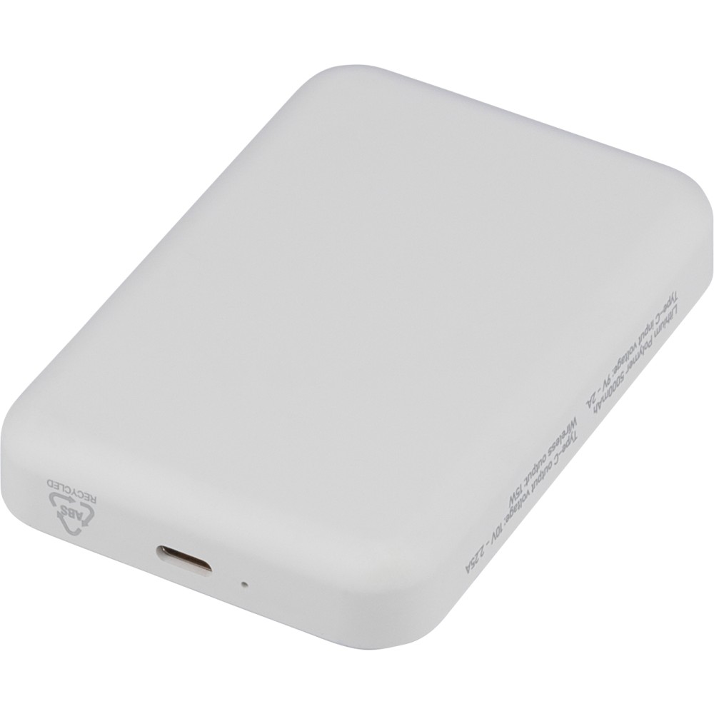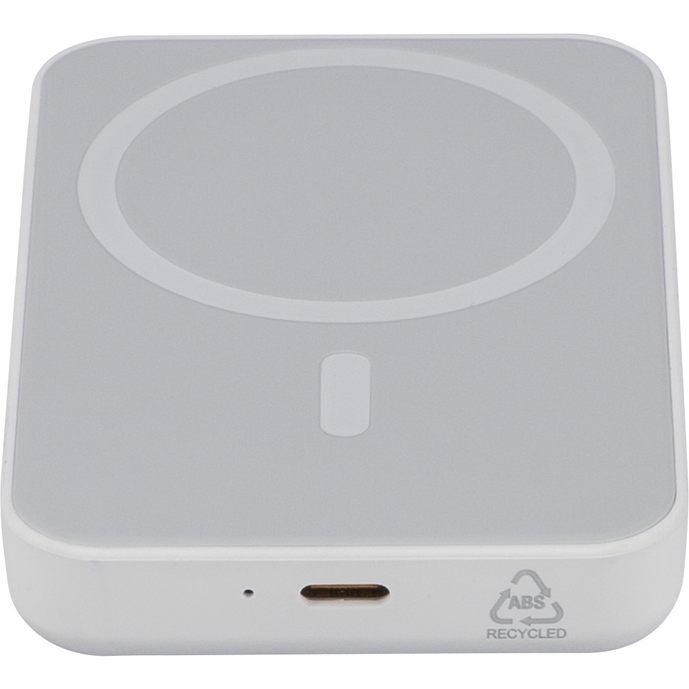 Recycled ABS wireless charger powerbank (5,000 mAh). 15W MagSafe-compatible wireless charging. Type-C in/out, safety protections, auto shut-off. Includes metal ring for non-MagSafe. Recycled ABS logo on side. Packed in brown box with tissue paper.