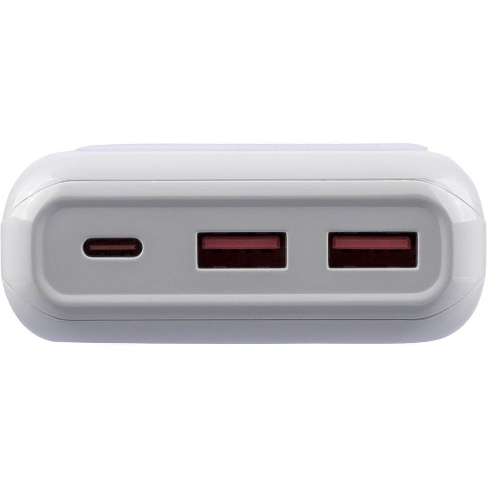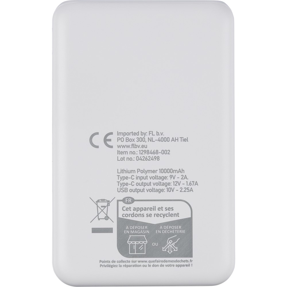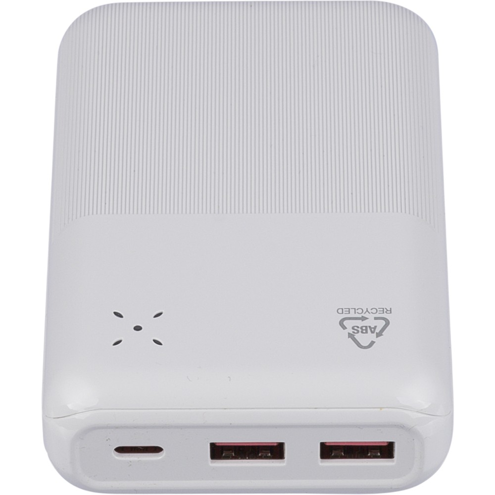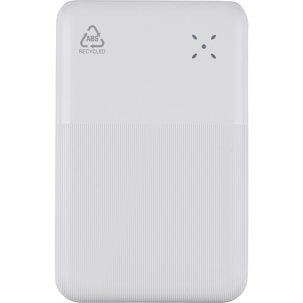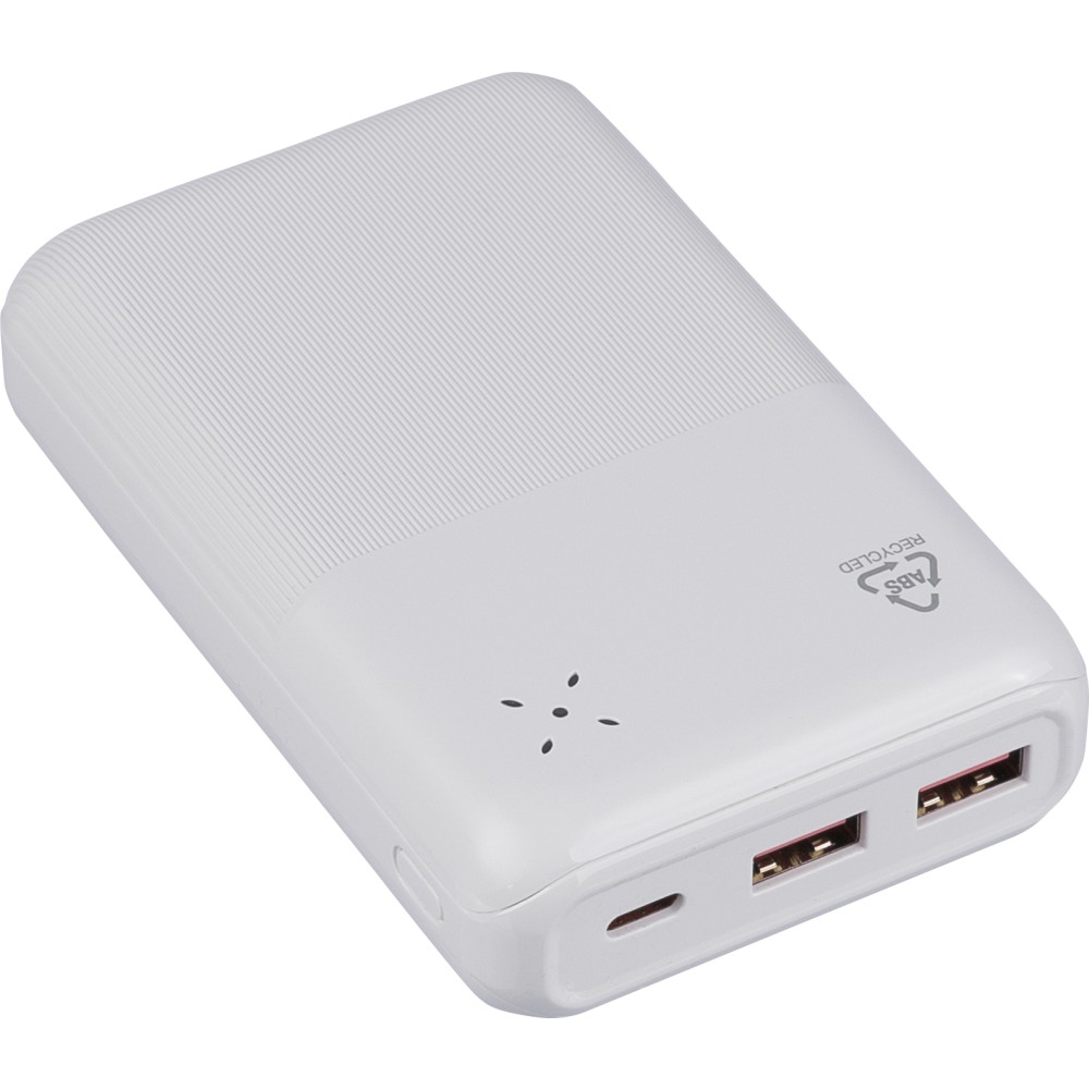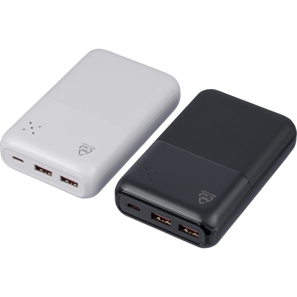Recycled ABS powerbank (20,000 mAh). 22.5W fast charging. Type-C in/out, Type-A input. LED indicator, safety protections. Recycled ABS logo on back. Packed in brown box with tissue paper.