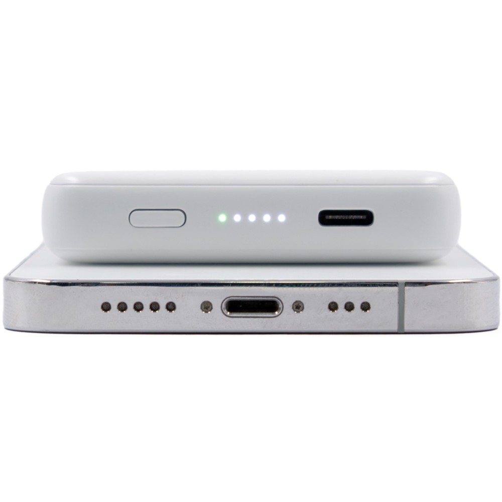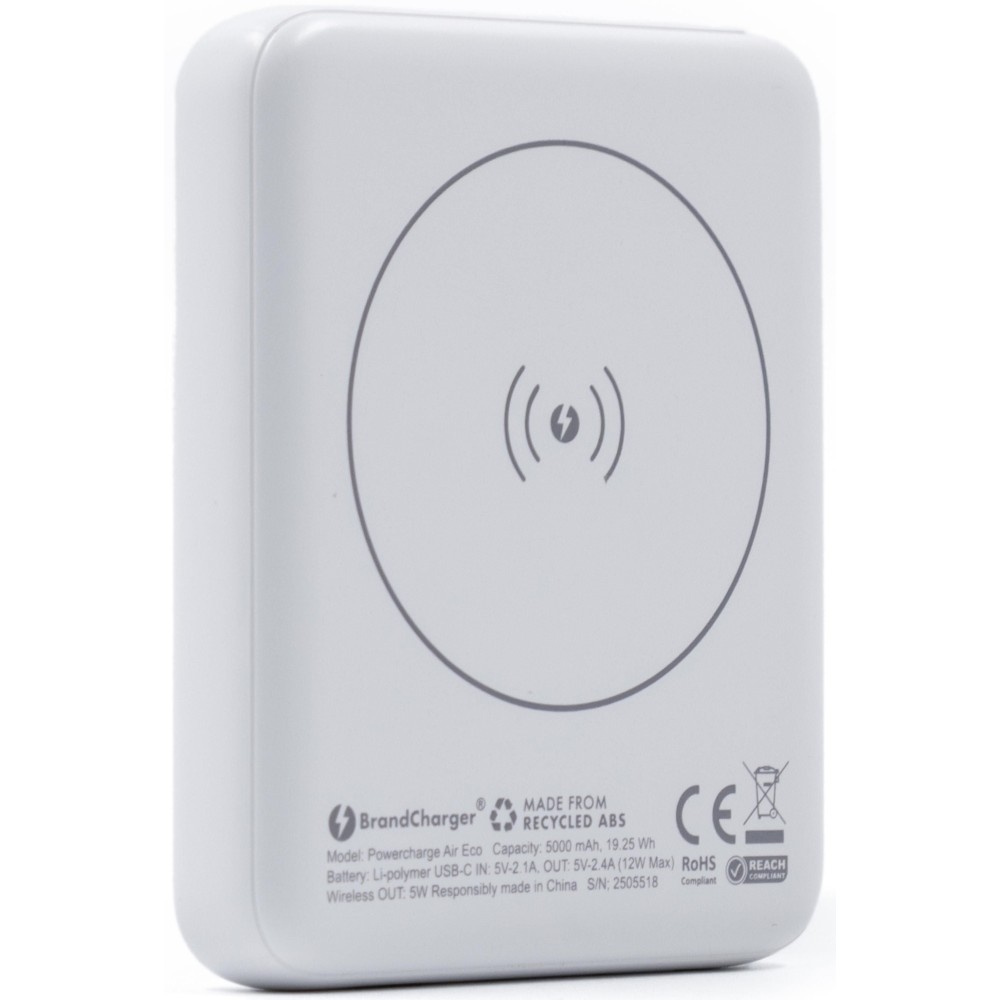 Powercharge Air is an ultra-slim, pocket-sized magnetic wireless powerbank made from recycled ABS. With a 5,000 mAh capacity, it supports 5W magnetic wireless charging compatible with MagSafe, Qi1, and Qi2 standards. Also features a 12W USB-C port for wired charging. Includes a smart safety chip for protection against overcurrent, overdischarge, overcharging, overheating, and short-circuiting. Equipped with LED indicator and smart performance engine. USB-C input: 5V. Wireless output: 5W.