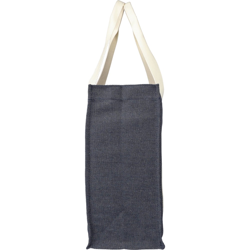 Denim (280 gsm) shopping bag with 15-centimeter gussets and long canvas (280 gsm) handles. The denim is made from 65% polyester and 35% cotton. Features one push button to close the bag. Denim color fastness is up to 2-3 levels.