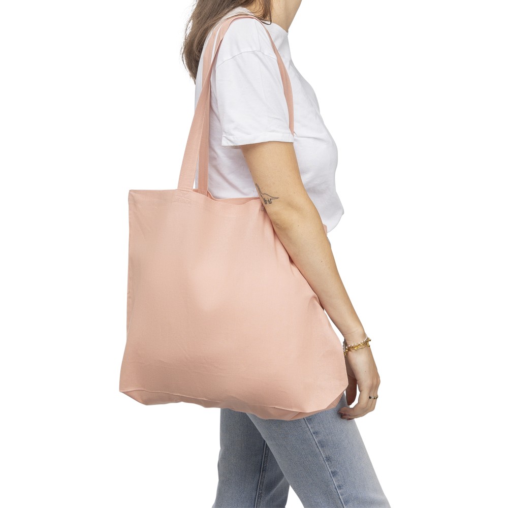 Oeko-Tex® cotton (140 gsm) shopping bag with 10 cm gusset and long handles (70 cm length, 2.5 cm width). Pastel-colored cotton in PMS 9562U (green), 162U (orange), 317U (blue), and 522U (purple). Includes Oeko-Tex® label.
