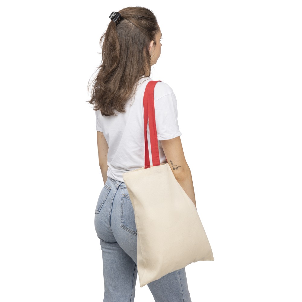 Oeko-Tex® cotton (140 gsm) shopping bag in natural color with colored handles. Size 38 × 42 cm with 70 cm long handles (2.5 cm width). Includes Oeko-Tex® label.