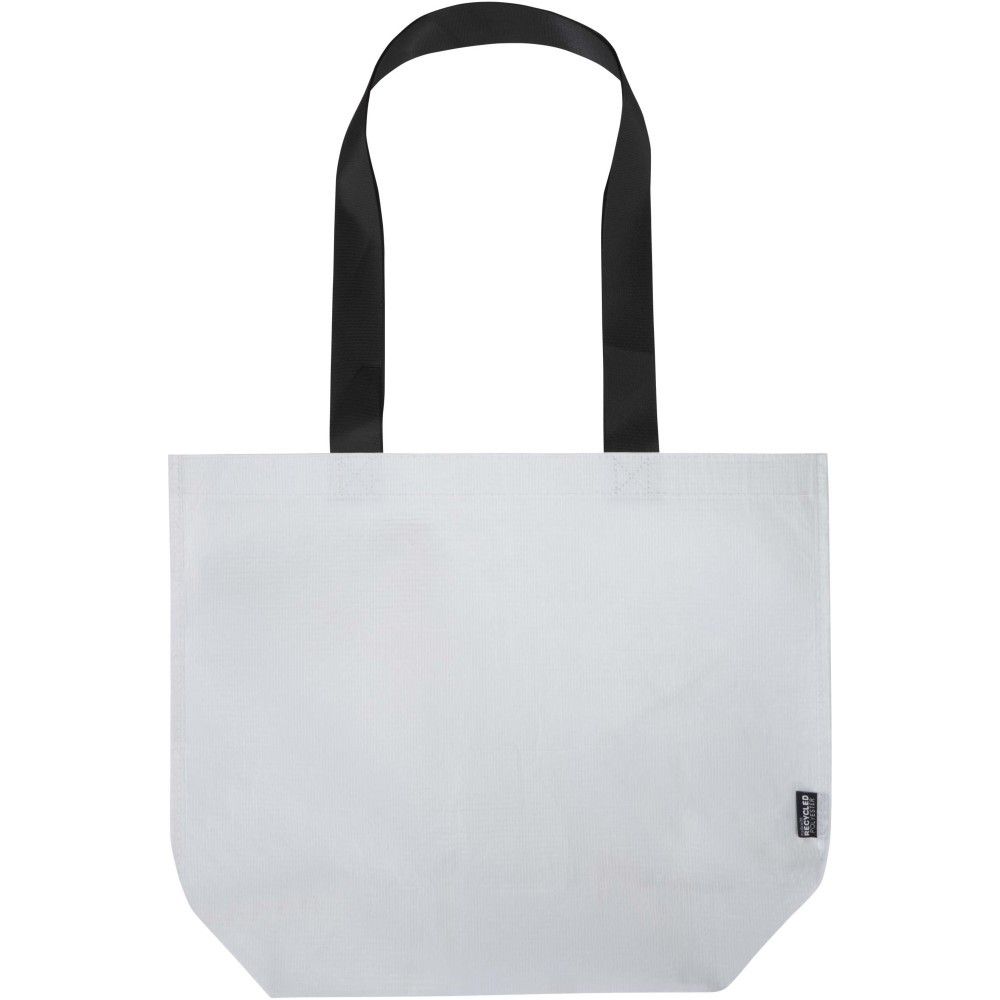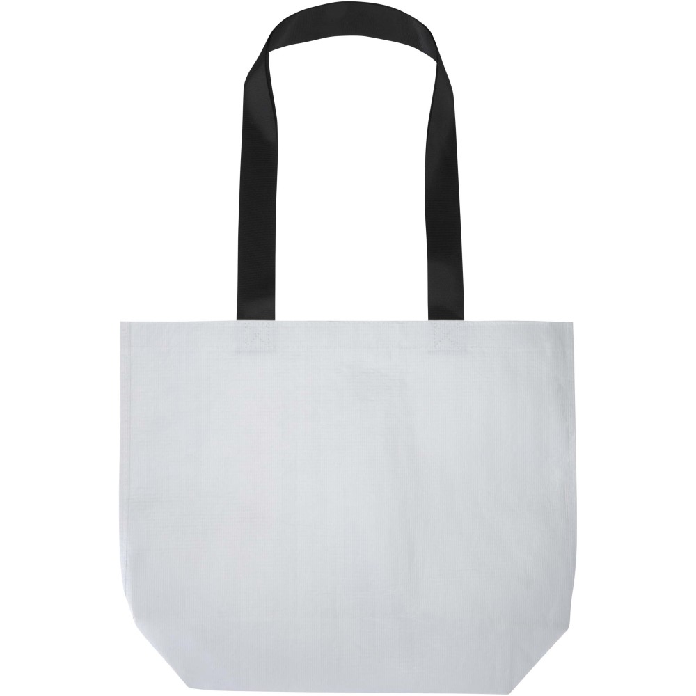 The Duo double laminated bottom tote bag is made from 150 g/m2 GRS certified RPET with double lamination, and offers enhanced durability and water resistance when it counts. It features a spacious open main compartment, sturdy reinforced handles, and a wide bottom for added capacity. Designed to carry up to 10 kg, it's a stylish and reliable option for daily errands, trade shows, or promotional events. Volume capacity: 18 litres.
