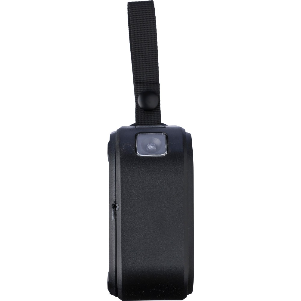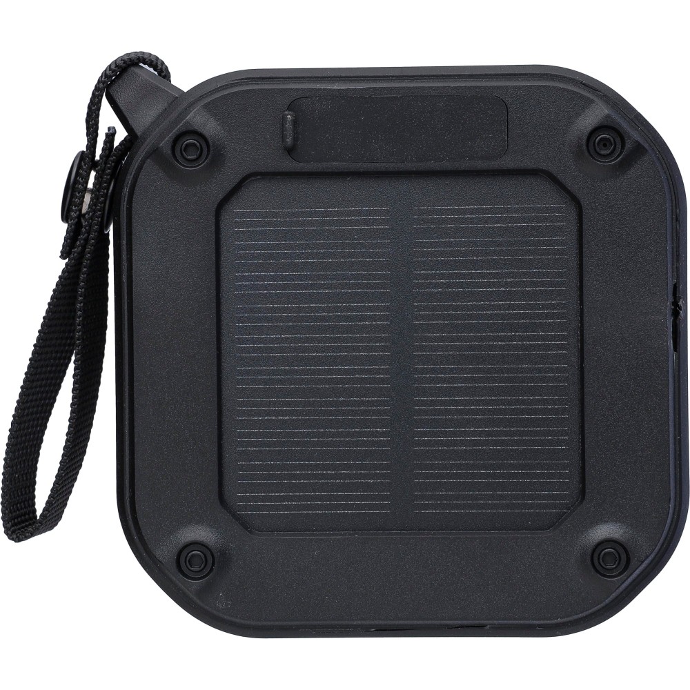 Recycled ABS outdoor speaker with wristband and carabiner. IPX6 rated. 3W output, DC 5V input, 400mAh built-in rechargeable battery, with 4 hours of playing time. Working distance of 15-20 meters, signal-to-noise ratio of 75 dB. Frequency range: 100 Hz to 20 kHz. Includes 30 cm Type-C charging cable, built-in LED flashlight (30 lumens), and solar panel to extend usage. Wireless connection technology: 5.3. Individually packaged in a brown cardboard box.