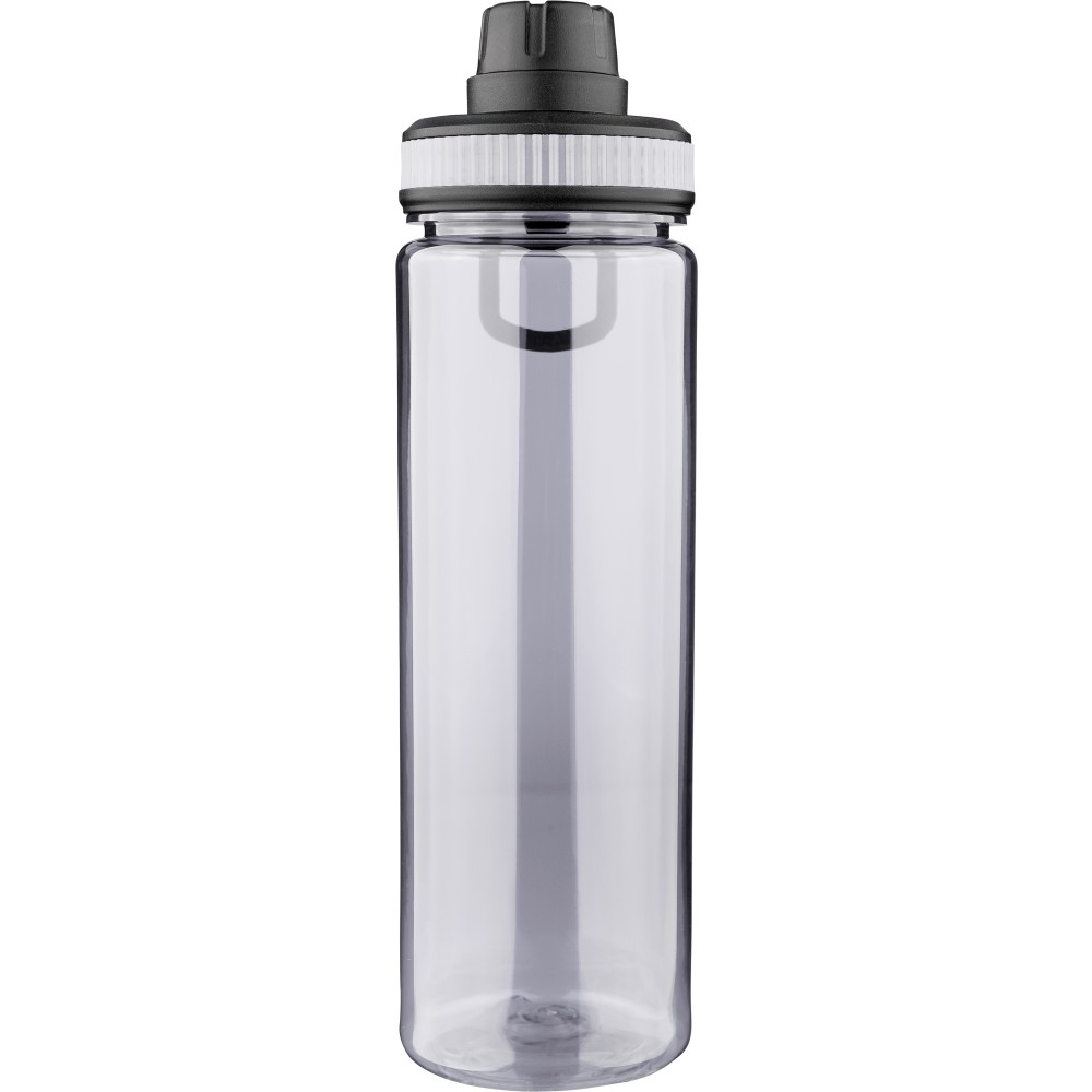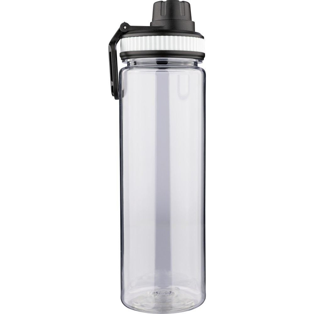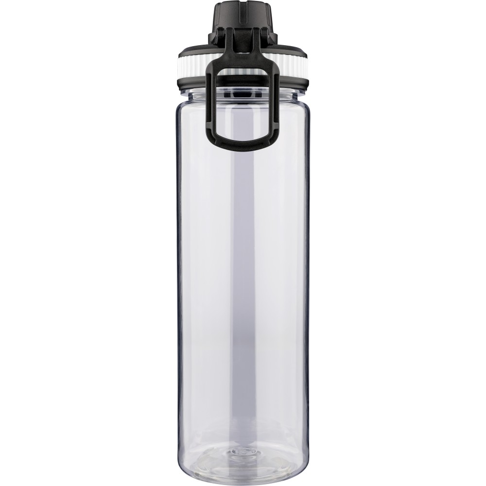 rPET drinking bottle (750 ml) with PP lid featuring a carrying handle and screw cap. Includes a colored silicone detail in the lid, matched to the transparent bottle body.