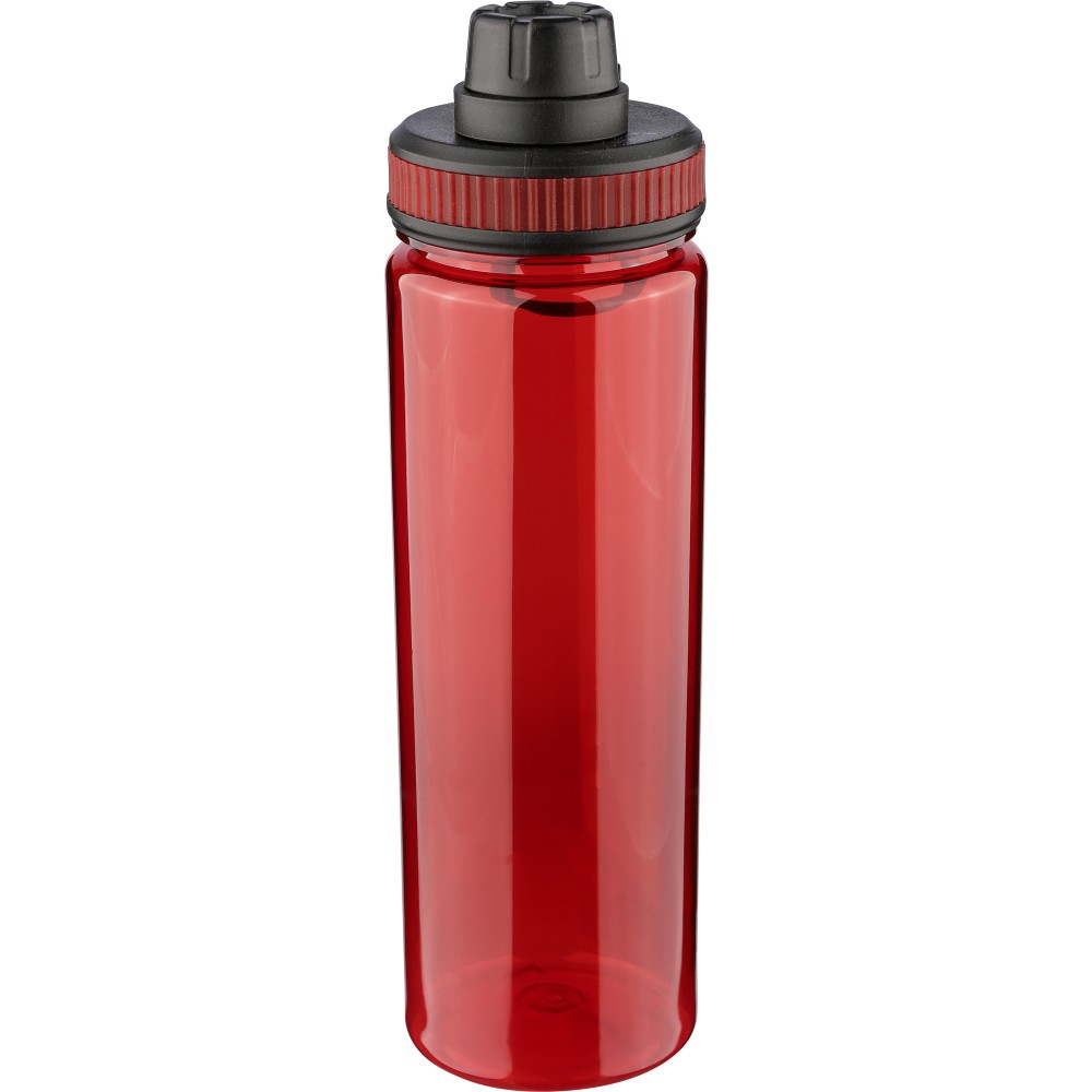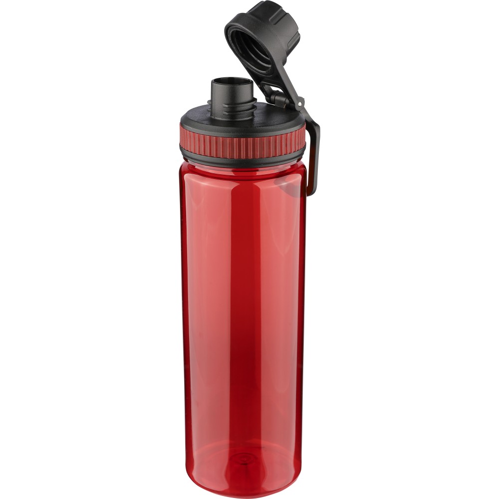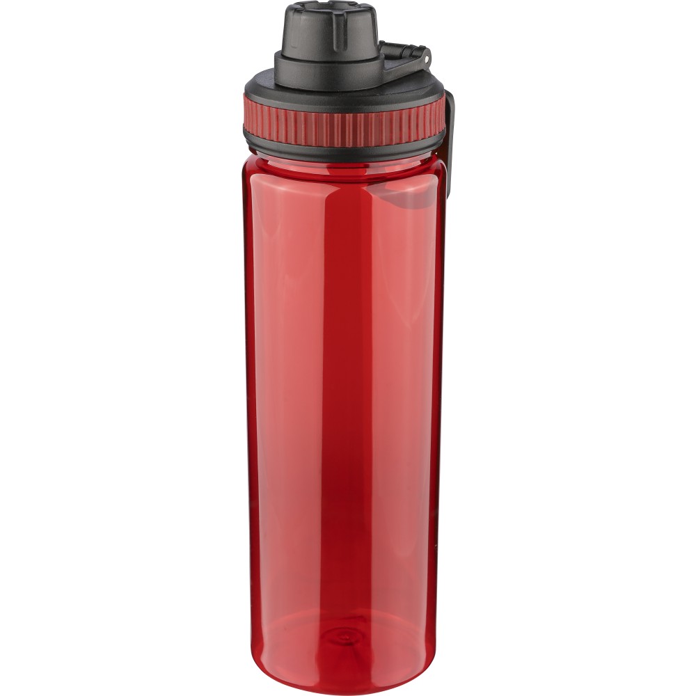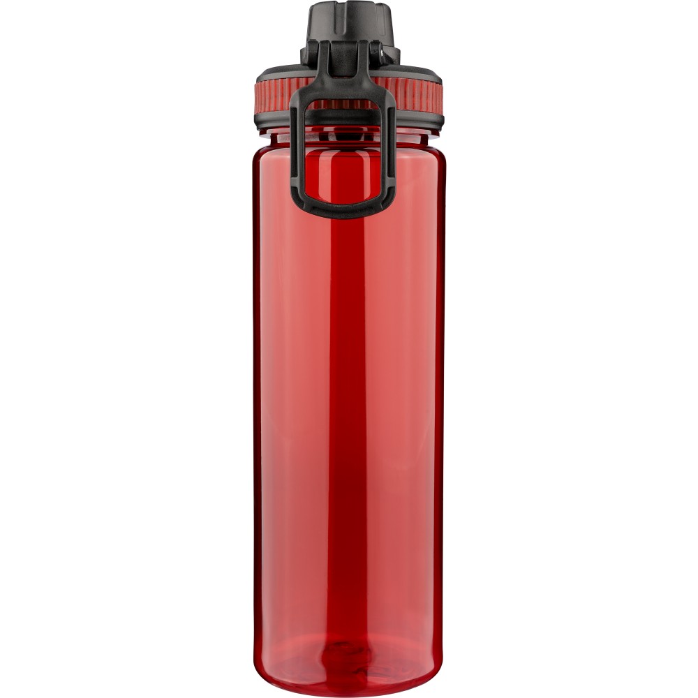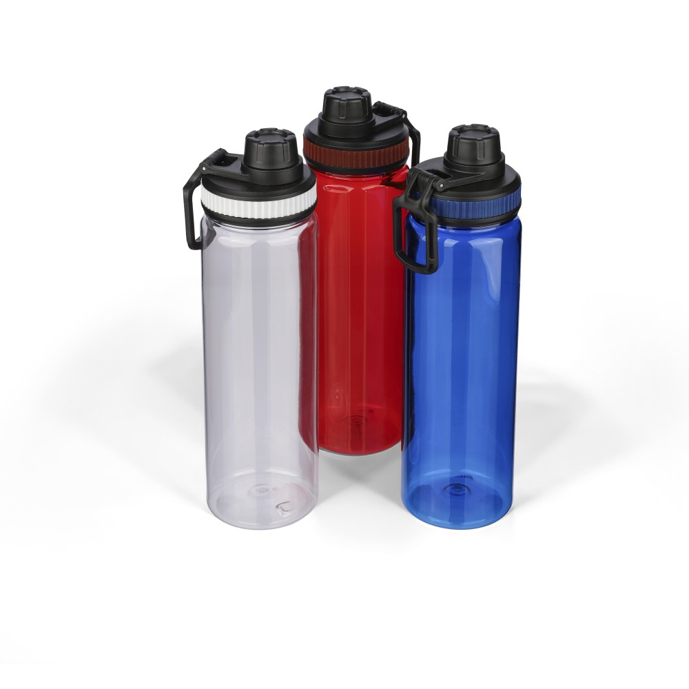 rPET drinking bottle (750 ml) with PP lid featuring a carrying handle and screw cap. Includes a colored silicone detail in the lid, matched to the transparent bottle body.