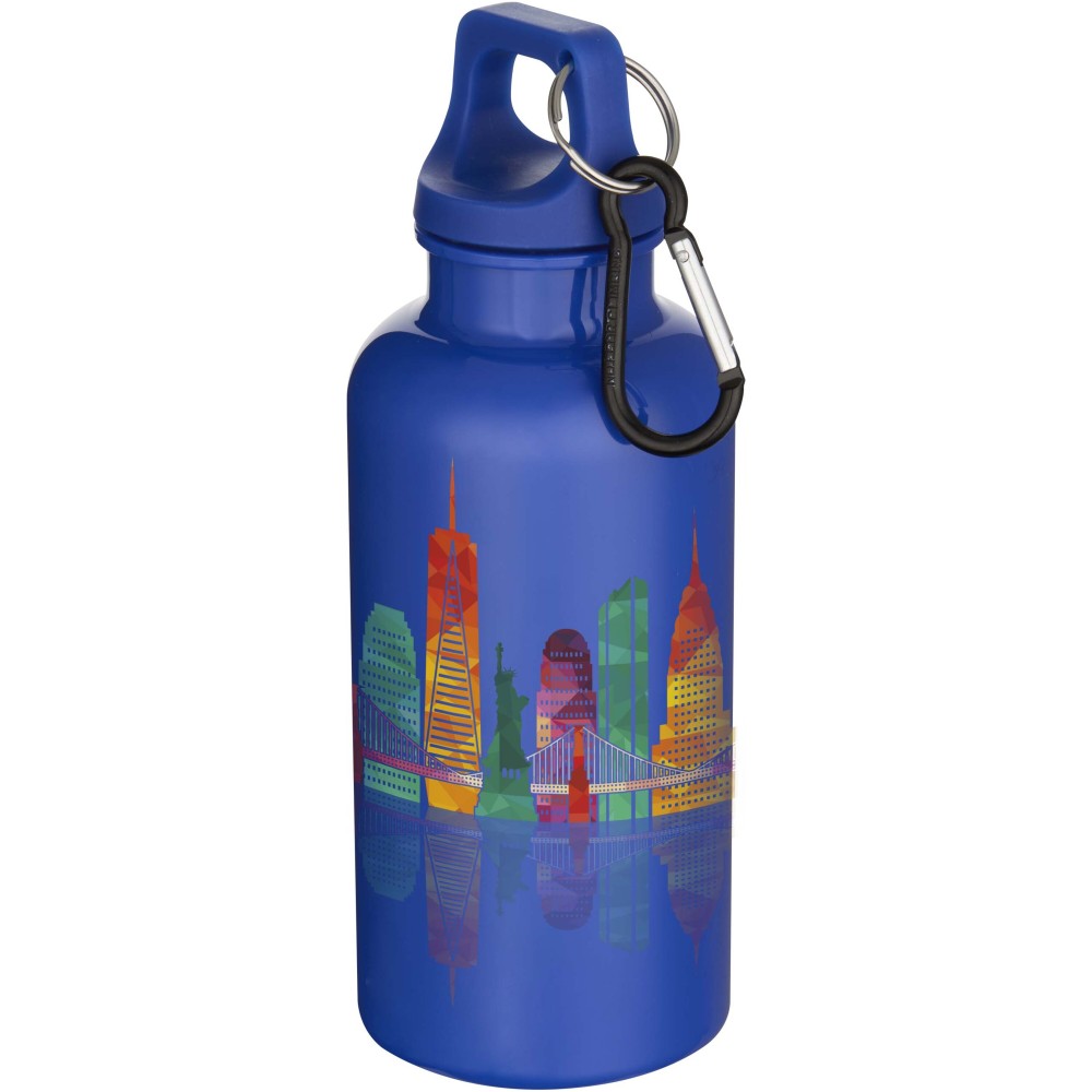 Staying hydrated at all times is possible with this durable yet lightweight 400 ml water bottle made from RCS certified recycled PET. It is the perfect companion while exercising, on day trips or at the office. The single-walled Oregon bottle has a twist-on lid and offers plenty of space to add any kind of logo. Clip the attached carabiner (not suitable for climbing) securely to a bag to avoid losing it. Manufactured in compliance with the EFSA approved PET recycling process.