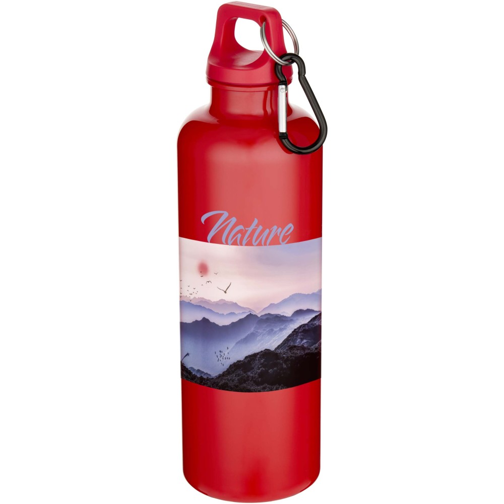 Staying hydrated at all times is possible with this durable yet lightweight 750 ml water bottle made from RCS certified RPET. It is the perfect companion while exercising, on day trips or at the office. The single walled Oregon bottle has a twist-on lid and offers plenty of space to add any kind of logo. Clip the attached carabiner (not suitable for climbing) securely to a bag to avoid losing it. In compliance with the EFSA approved PET recycling process.