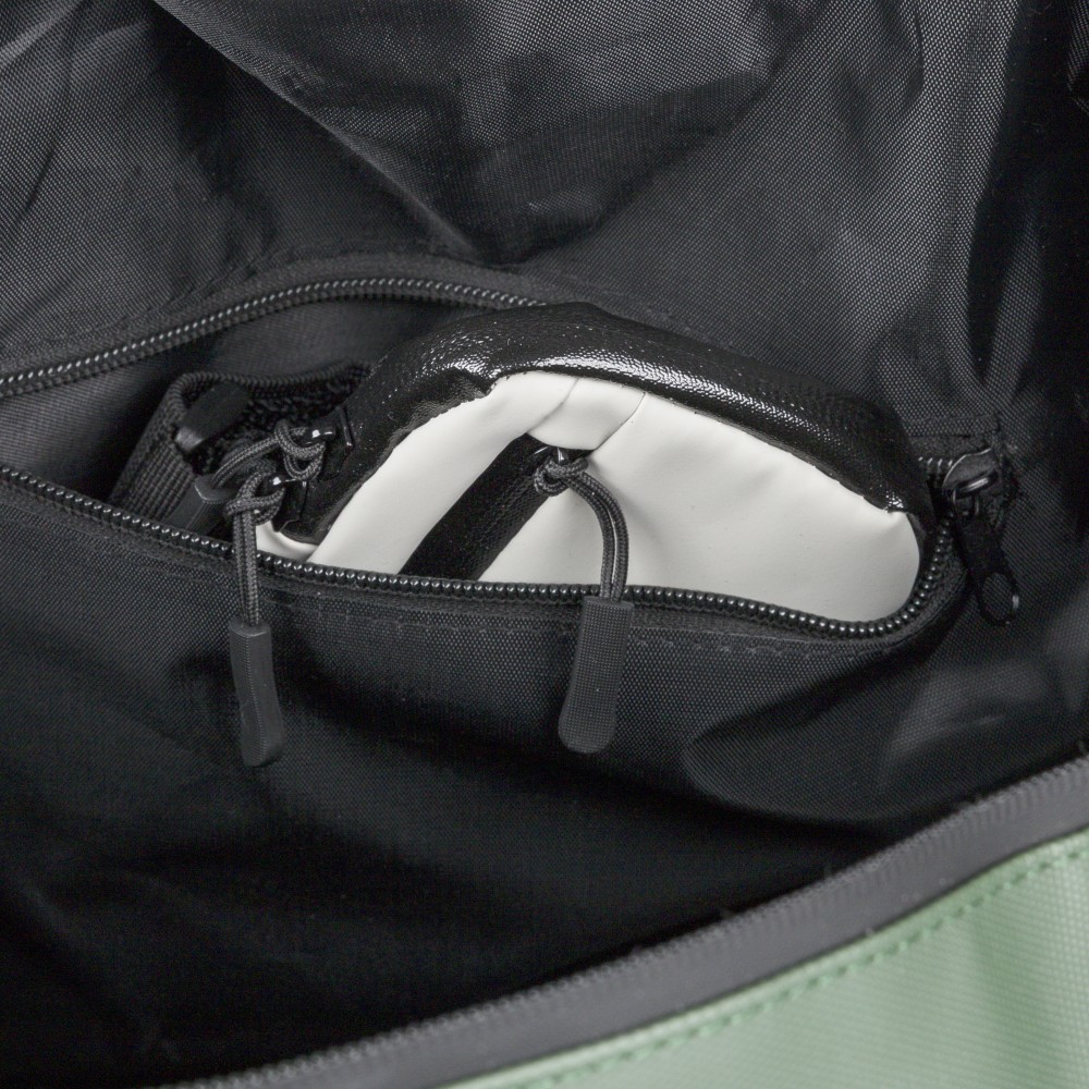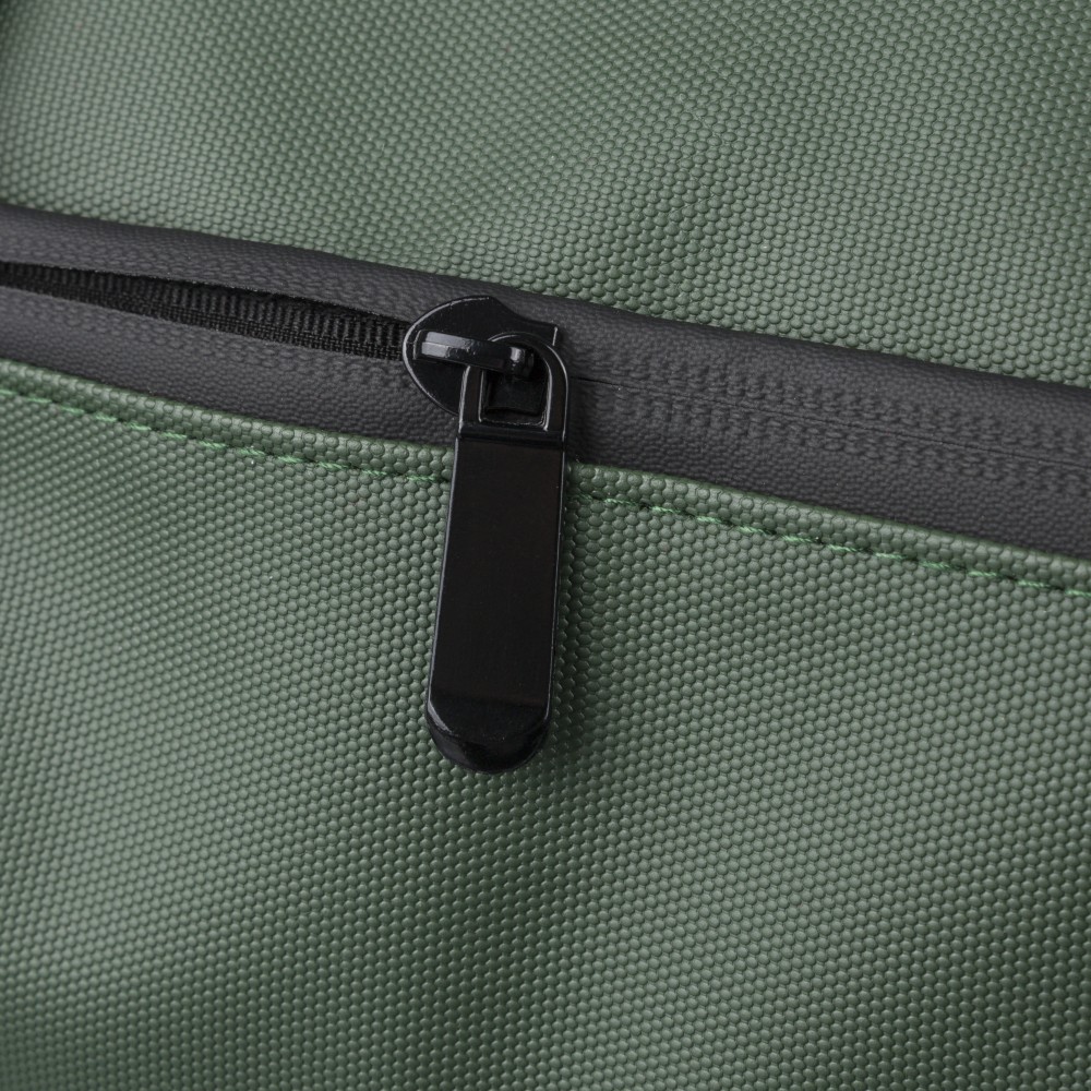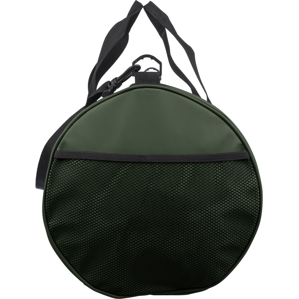 rPET duffle bag made from 600D polyester with 210D lining and water-repellent PU coating. Features a 40 l main compartment, front and side zippered pockets, mesh side pocket, two handles, and adjustable shoulder strap. Includes external rPET label.