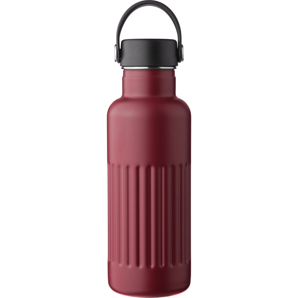 Recycled stainless steel double-walled drinking bottle (500 ml). The interior is made of stainless steel 304, and the exterior is stainless steel 201 with a ridge grip design. Features a PP and iron lid with a TPE handle for easy carrying. Includes an engraved recycled logo on the body. Individually packaged in a brown cardboard box.