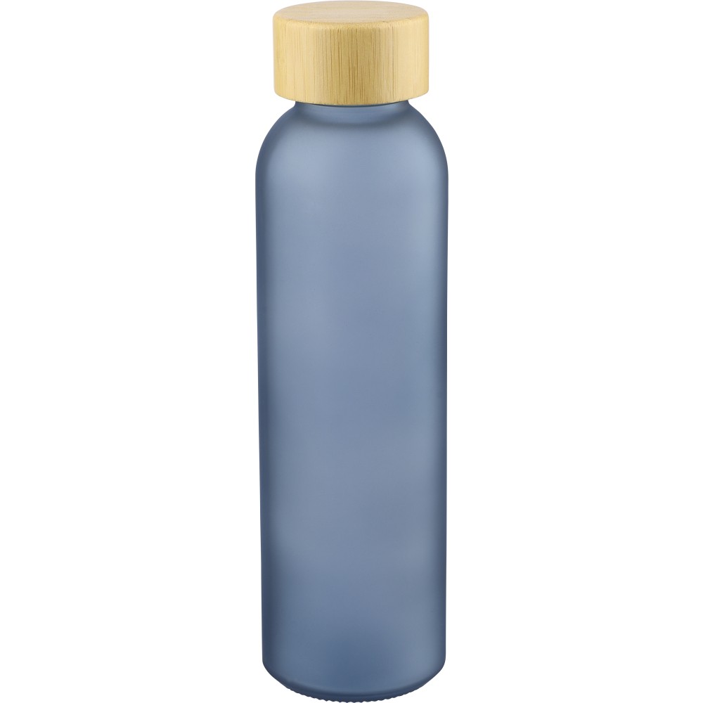 Glass drinking bottle (500 ml) with a frosted coated body and bamboo screw lid with PP inner core. Made from sodium calcium glass, suitable for cold drinks only. Individually packaged in a brown cardboard box.