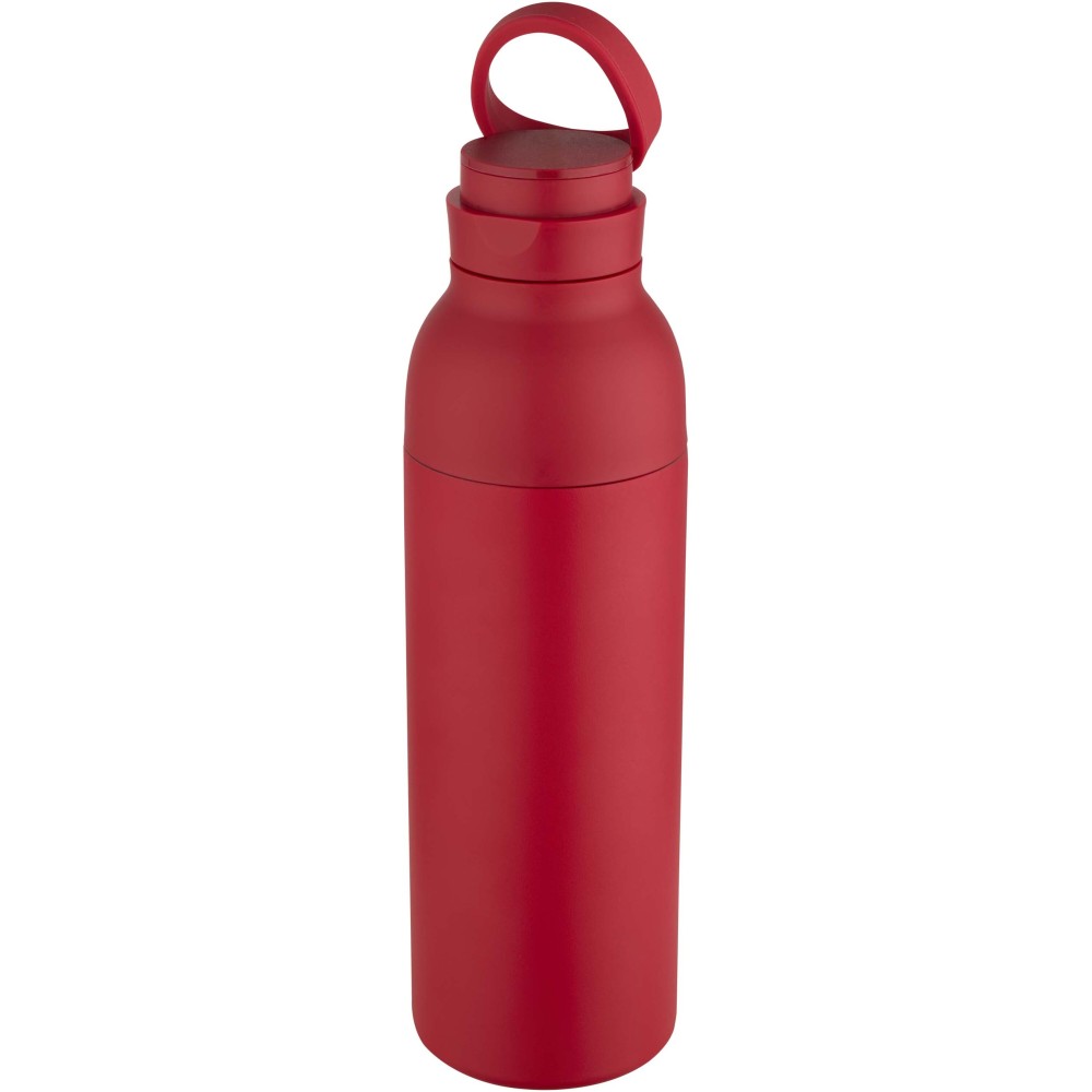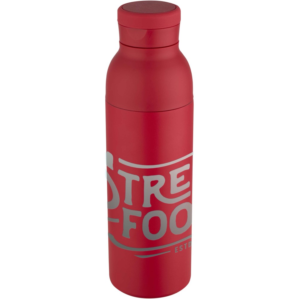 Double-walled, vacuum-insulated, RCS certified stainless steel water bottle featuring a discreet built-in silicone handle within the lid. Keeps drinks cold for 48 hours or hot for 12 hours. The two-piece construction makes cleaning easy, while the durable powder coating and copper plating ensure long-lasting performance. Presented in a recycled cardboard gift box. Volume capacity: 650 ml.