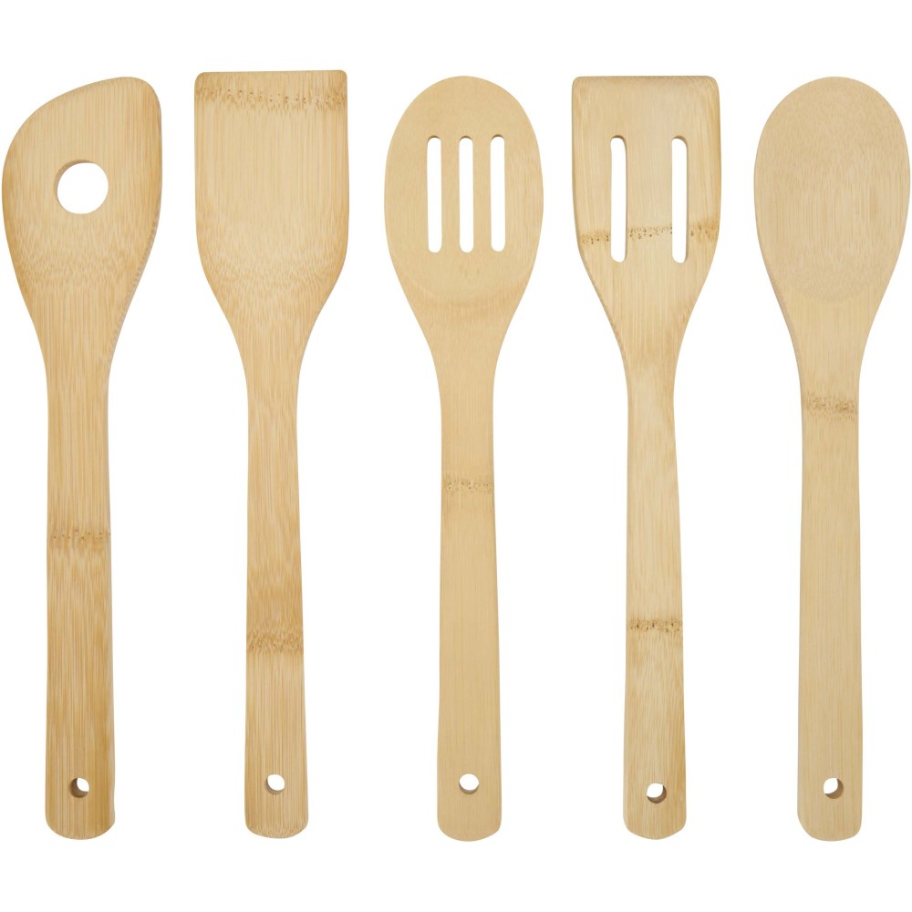 A set of bamboo kitchen spatulas with a matching holder, designed to be durable, lightweight, and safe for non-stick cookware. This natural set is ideal for everyday cooking and helps keep your kitchen organised. It includes a spoon (29.8 × 5.8 cm), a slotted spoon (29.8 × 5.8 cm), a turner (30.3 × 6.1 cm), a slotted turner (30 × 6 cm), and a slotted paddle (30 × 6 cm), with all tools made 0.8 cm thick for reliable use.