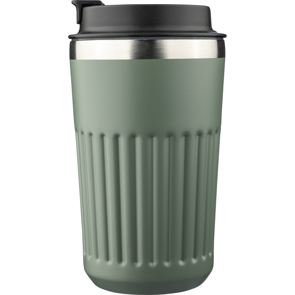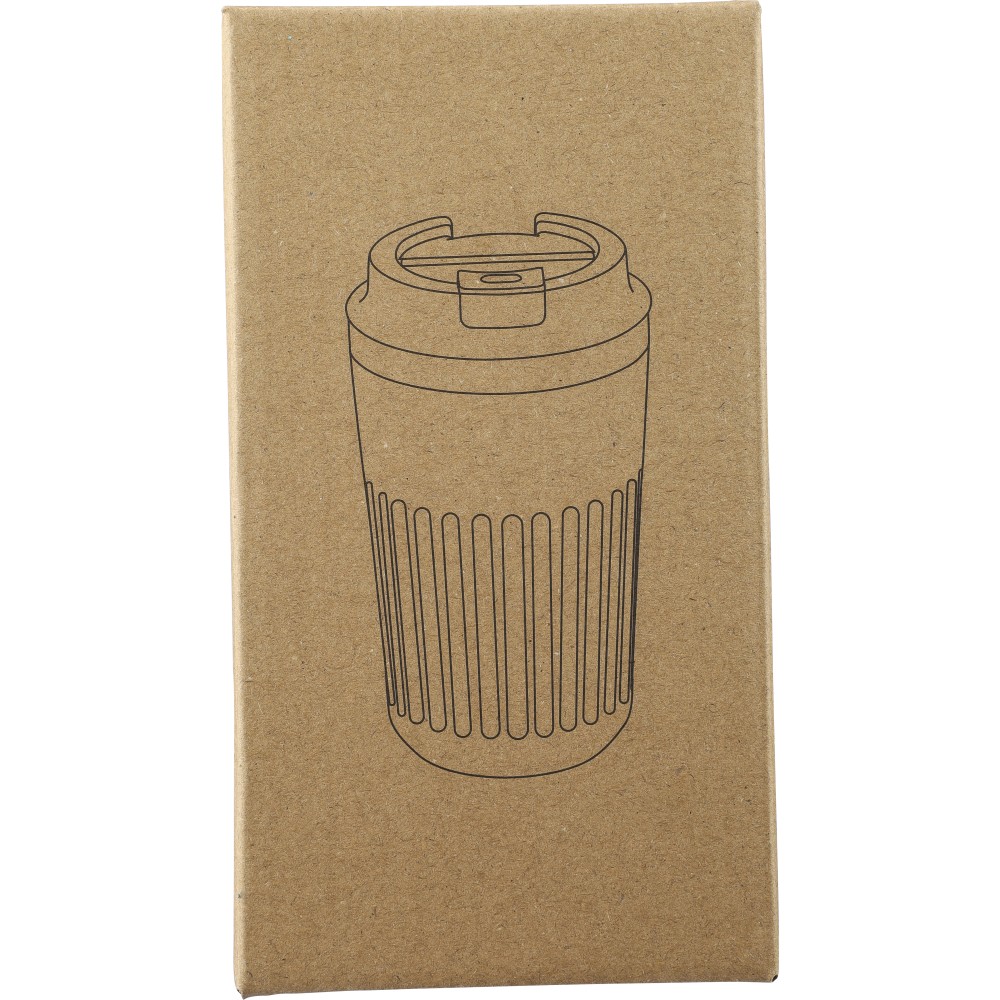 Recycled stainless steel travel mug (400 ml) with double wall and outer ridges. Inner 304 stainless steel, outer 201 stainless steel, with PP lid. Engraved recycled logo on the body. Packed in brown cardboard box.