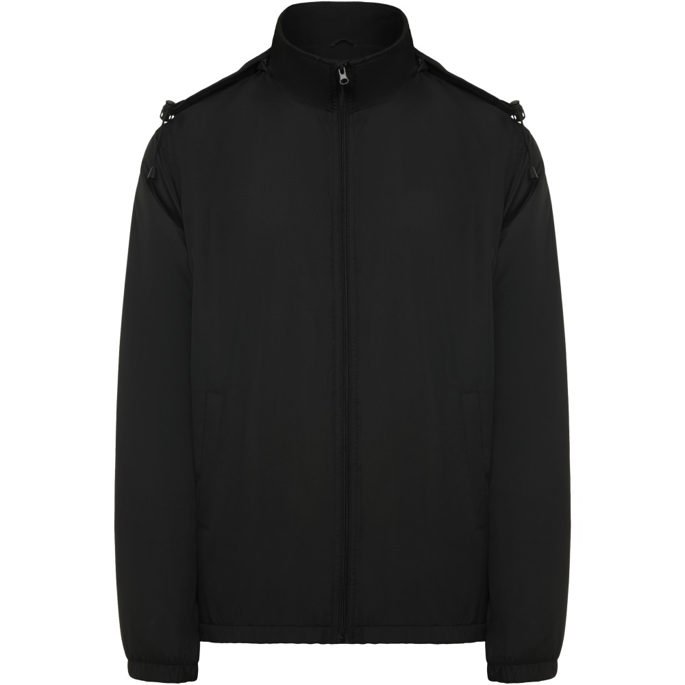 Light waterproof jacket. High collar and foldable hood with adjusters. Microfleece lining. Front zip and chin protector. Elastic cuffs. Two side pockets with zip. Interior left chest pocket. Removable label. Waterproof. Wind-proof. The male model is 184 cm and is wearing size L, and the female model is 174 cm and is wearing size S. 100% Polyester, 85 g/m2, Lining, Micro fleece of 100% Polyester, 180 g/m2, Padding/filling, of 100% Polyester, 65 g/m2.