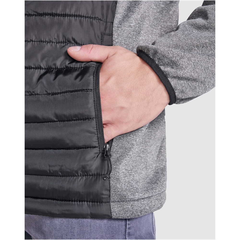 Unisex jacket in two-fabric combination: Fixed adjusted hood. Raglan sleeves. Sleeves, side panels and hood in softshell fabric. Quilted feather touch fabric in front and back. Inverted zip with matching chin protector and puller. Two front pockets with zippers. Matching elastic trim in collar, cuffs and hem. Removable label. Wind-proof model. The male model is 184 cm and is wearing size L, and the female model is 179 cm and is wearing size S.