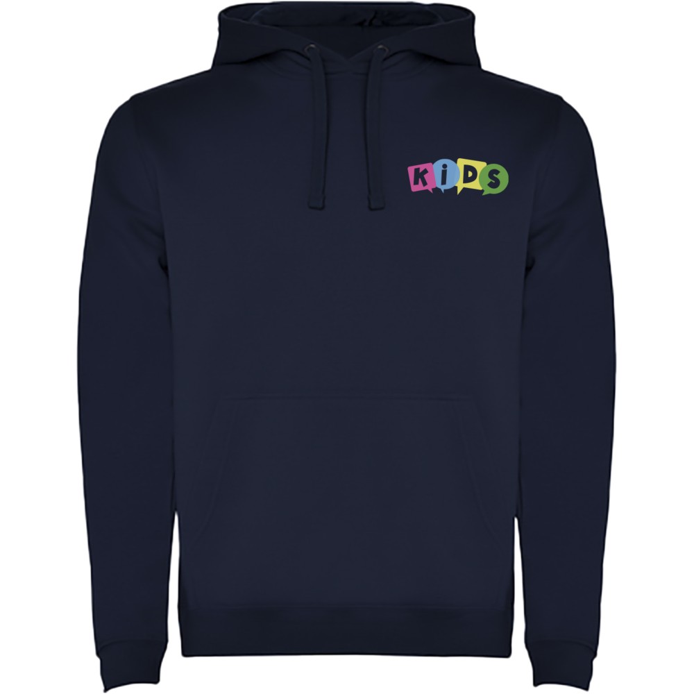 Two-colour hoodie with double fabric. Reinforced covered seams in collar and kangaroo style pocket. 1x1 elastane rib in cuffs and waistband. Removable label. The model is 120 cm and is wearing size 5/6.