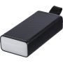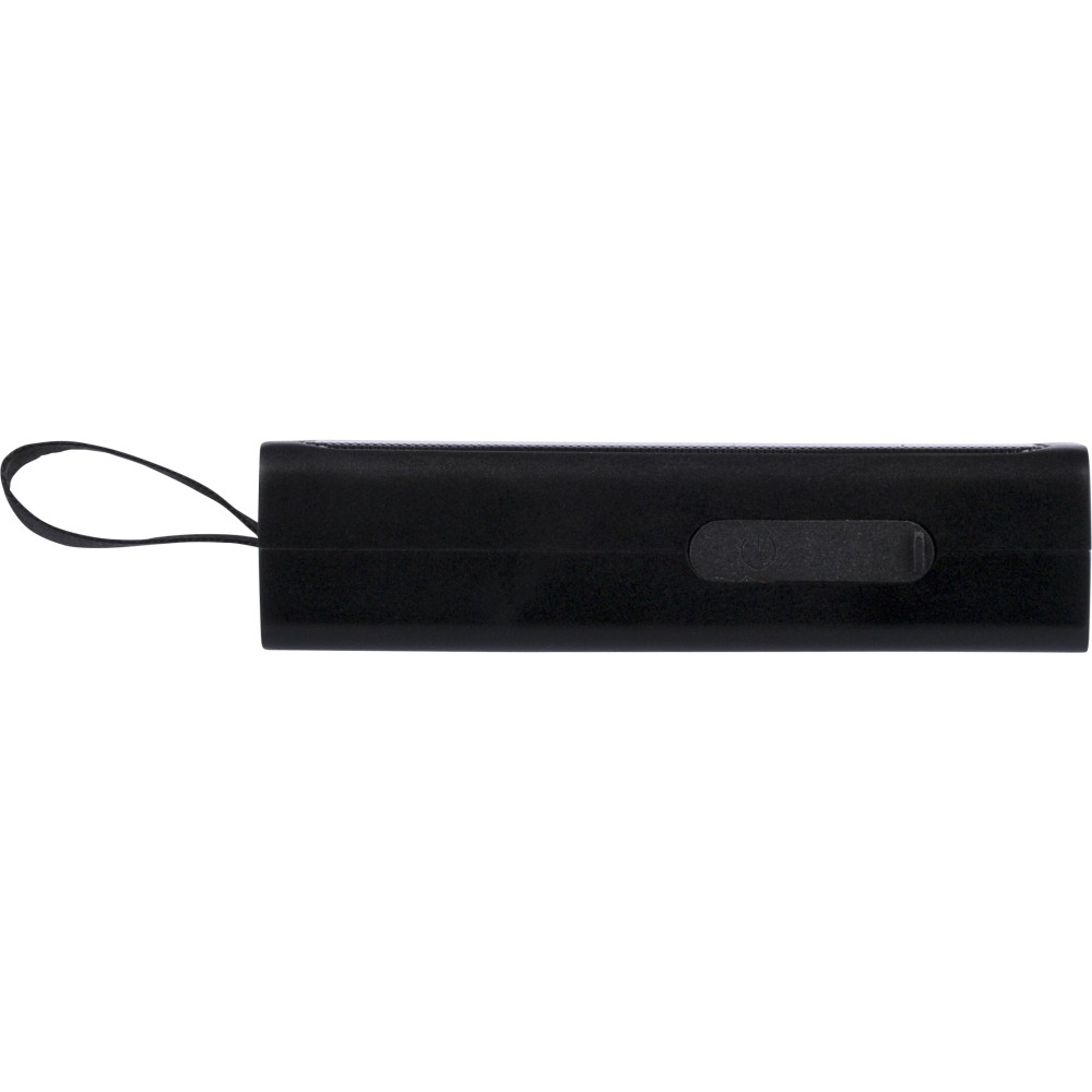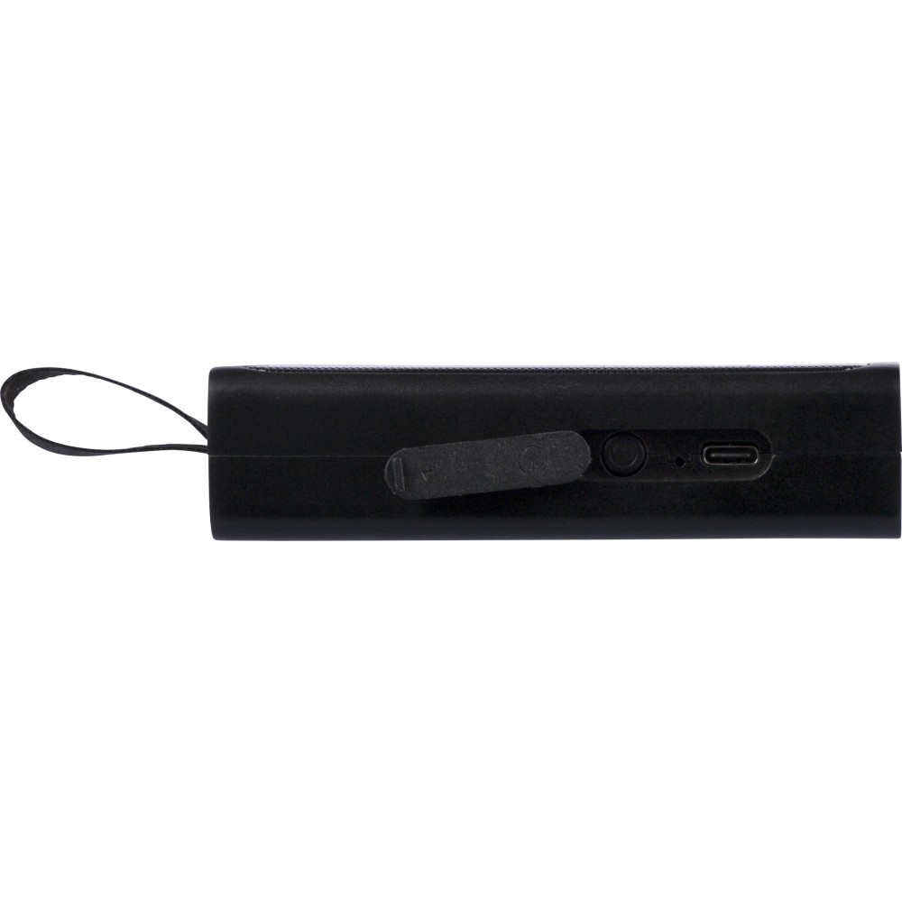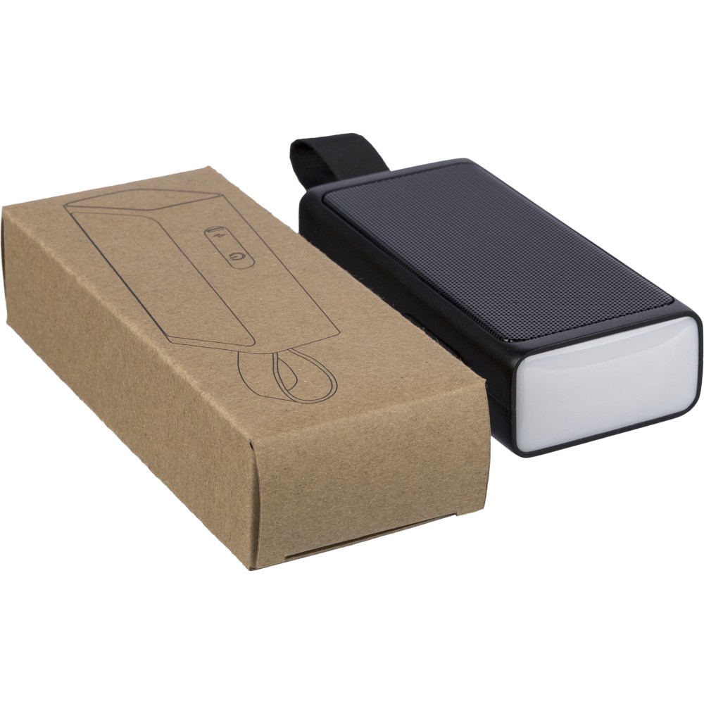 Recycled ABS 5W speaker with COB LED flashlight, silicone loop, and wireless tech 5.4. 500 mAh battery, 5V/500 mA input. Outdoor design with recycled logo. Packed in brown box.