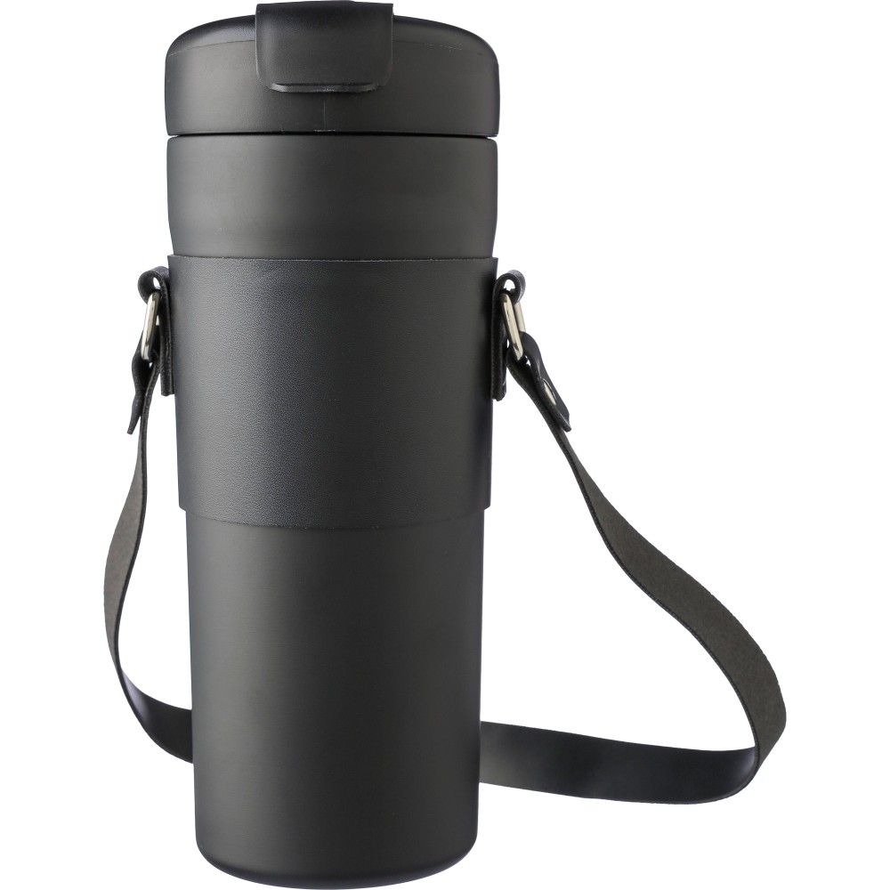 Stainless steel double-walled drinking bottle (730 ml) with a PU carrying sleeve, straw, and strap. The interior is made of stainless steel 304, and the exterior is stainless steel 201. PP lid with a push button to open or close the spout, and a separate drinking opening. Keeps contents hot for 6 hours and cold for 10 hours. Individually packaged in a brown cardboard box.