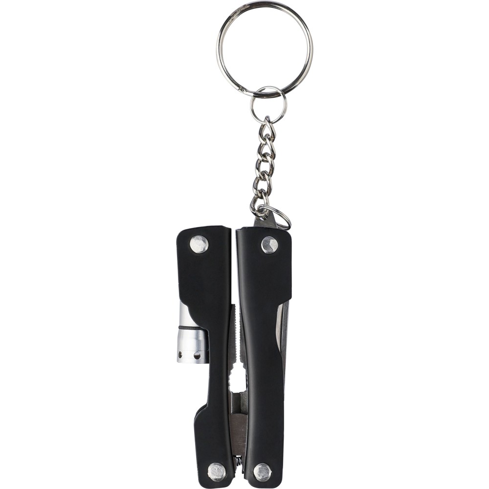 Stainless steel foldable multi-tool with 10 functions. With a single LED flashlight. Packaged in a 600D polyester pouch with Velcro closure. Pouch attachable to belt. Including batteries. Individually packaged in a brown cardboard box.